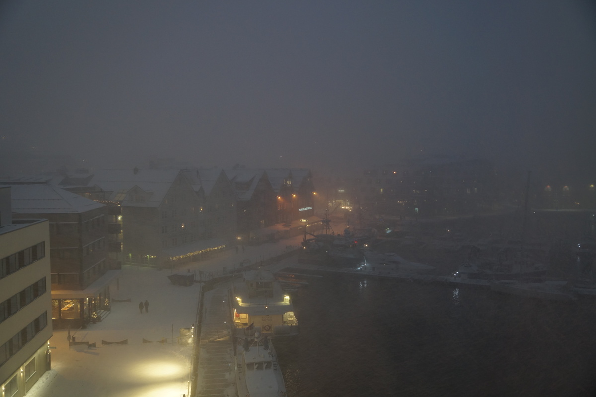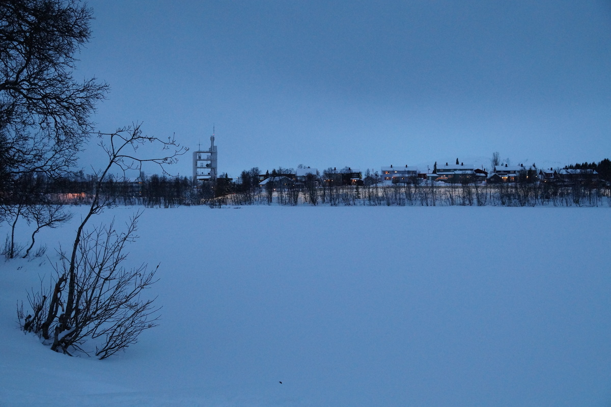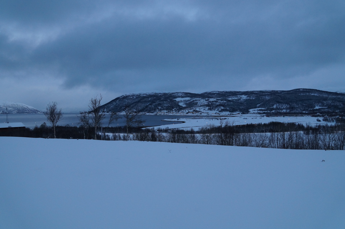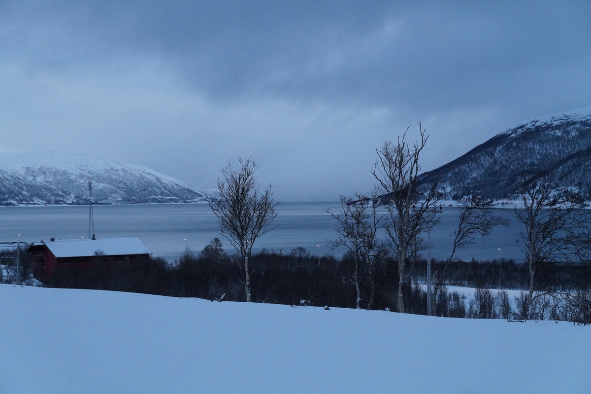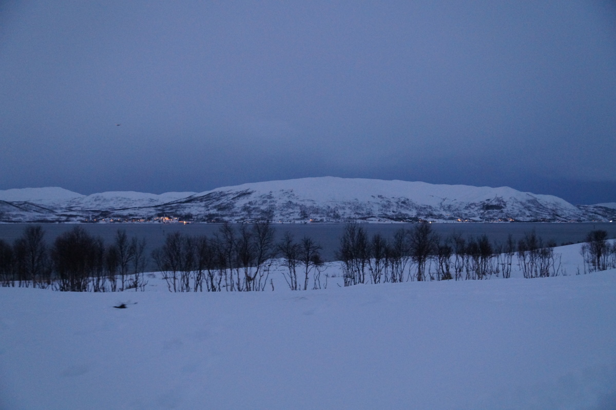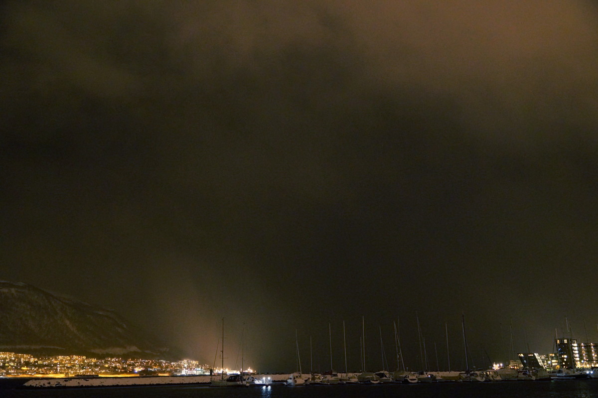 Polarlichter? Leider keine. Ein paar wenige aus unserer Gruppe hatten eine zusätzliche Bustour in die Nacht gebucht und waren tatsächlich erfolgreich (irgendwo hinter der Grenze nach Finnland), aber für die weit überwiegende Zahl der übrigen Teilnehmer hieß es: Schneefall, Schneefall, Wolken, Wolken. Und wenn mal die Wolken weg waren, war nichts zu sehen. Ich probierte ein paar Testaufnahmen mit langer Belichtung, aber es war ein reines Blau zu sehen- zwischen orange Wolken.