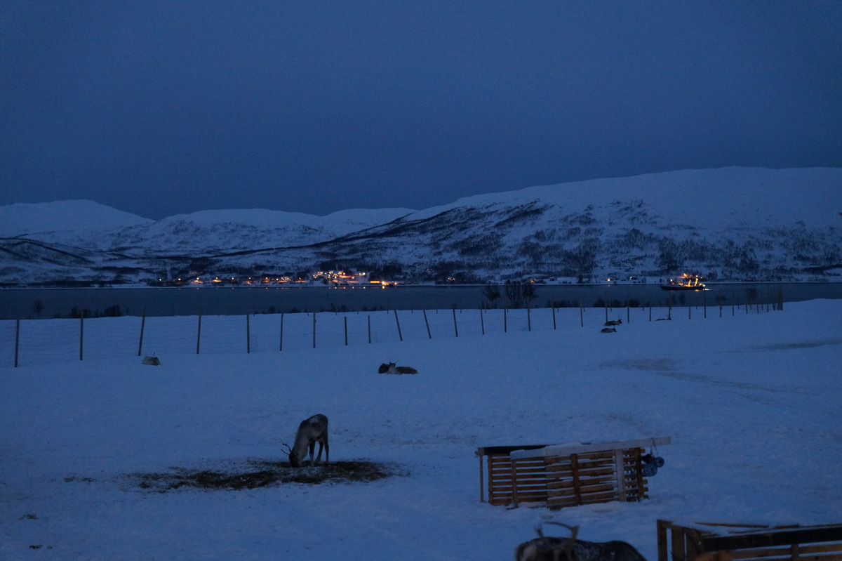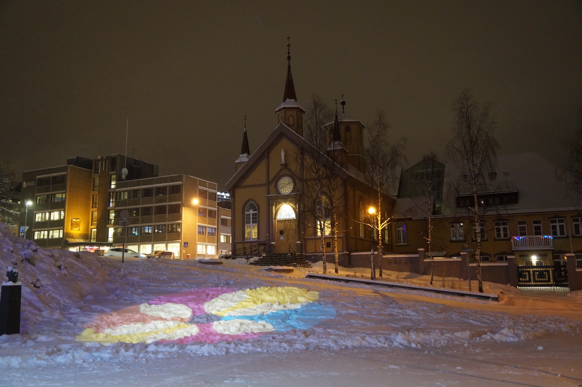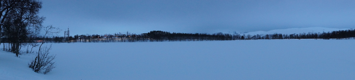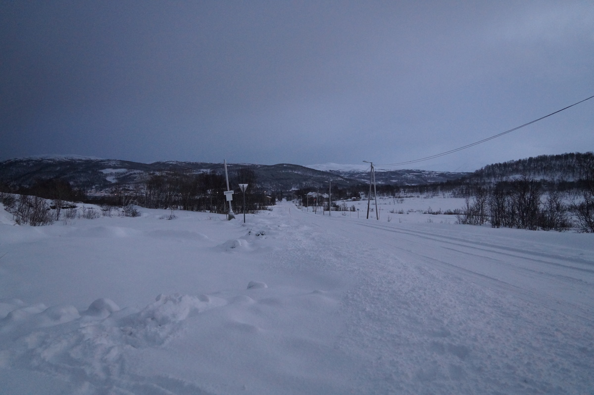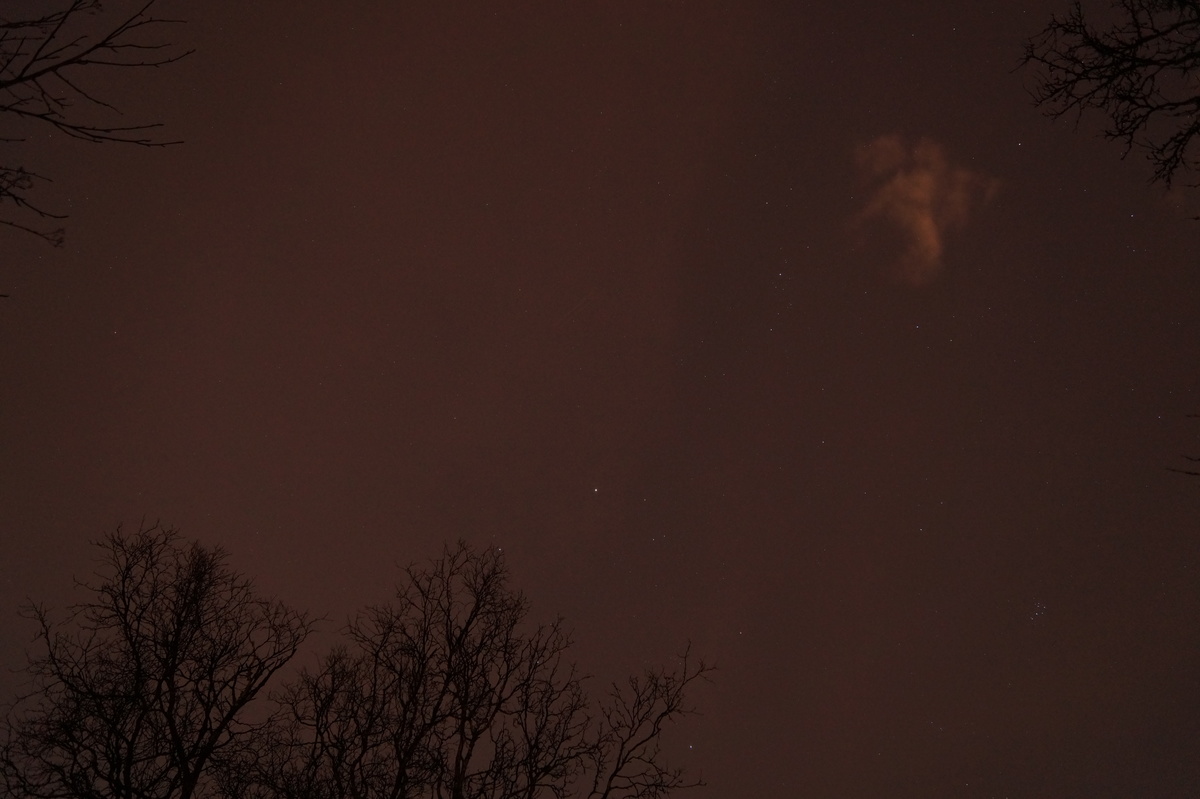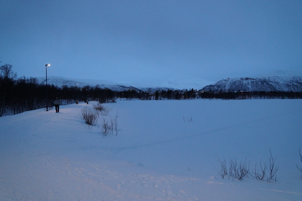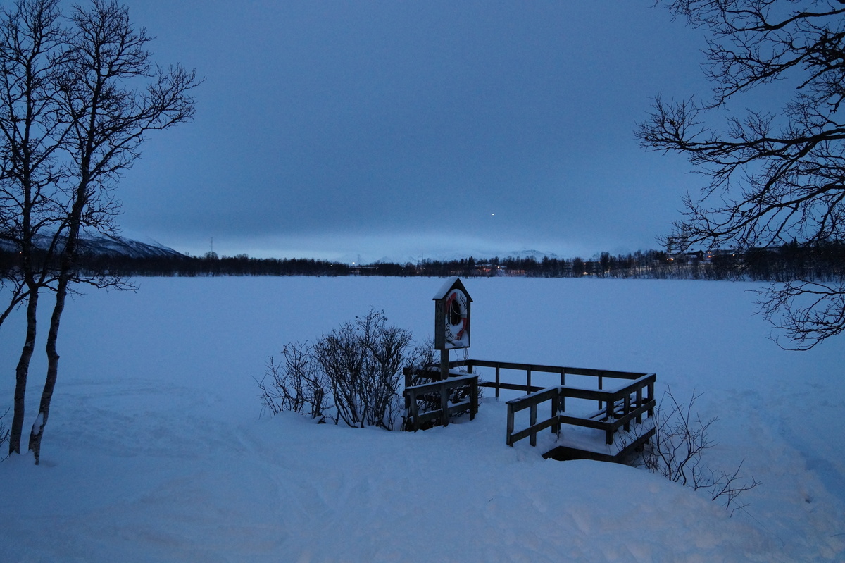 Polarlichter? Leider keine. Ein paar wenige aus unserer Gruppe hatten eine zusätzliche Bustour in die Nacht gebucht und waren tatsächlich erfolgreich (irgendwo hinter der Grenze nach Finnland), aber für die weit überwiegende Zahl der übrigen Teilnehmer hieß es: Schneefall, Schneefall, Wolken, Wolken. Und wenn mal die Wolken weg waren, war nichts zu sehen. Ich probierte ein paar Testaufnahmen mit langer Belichtung, aber es war ein reines Blau zu sehen- zwischen orange Wolken.