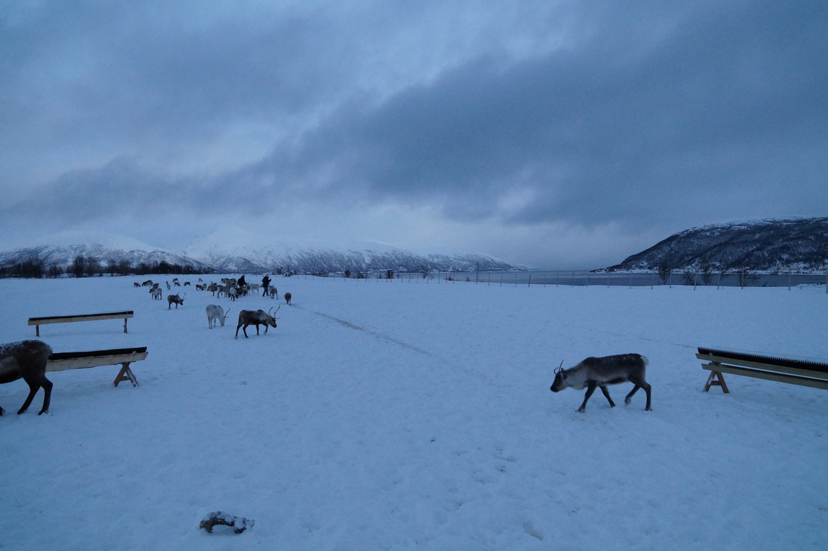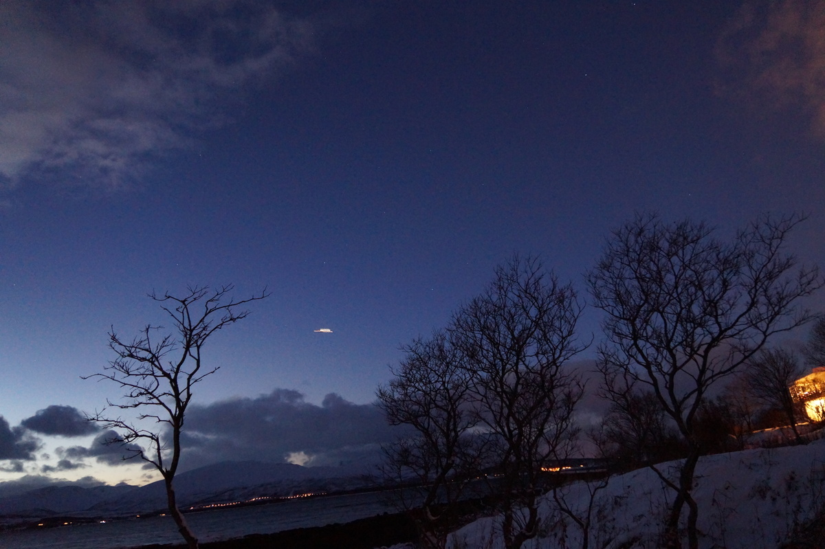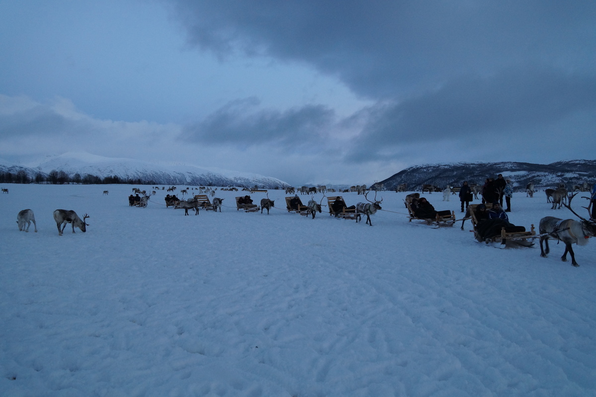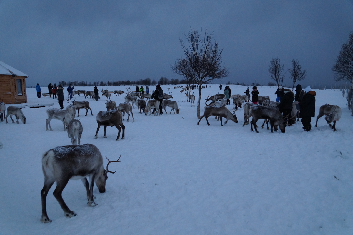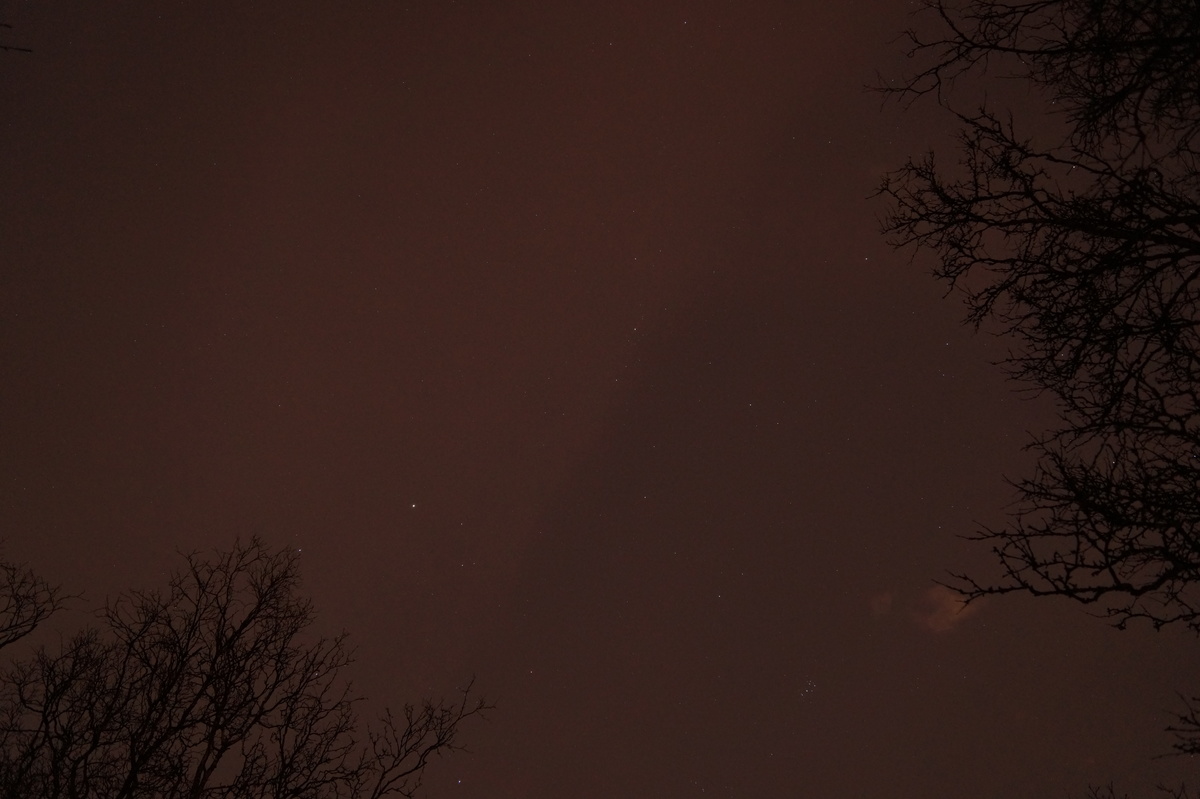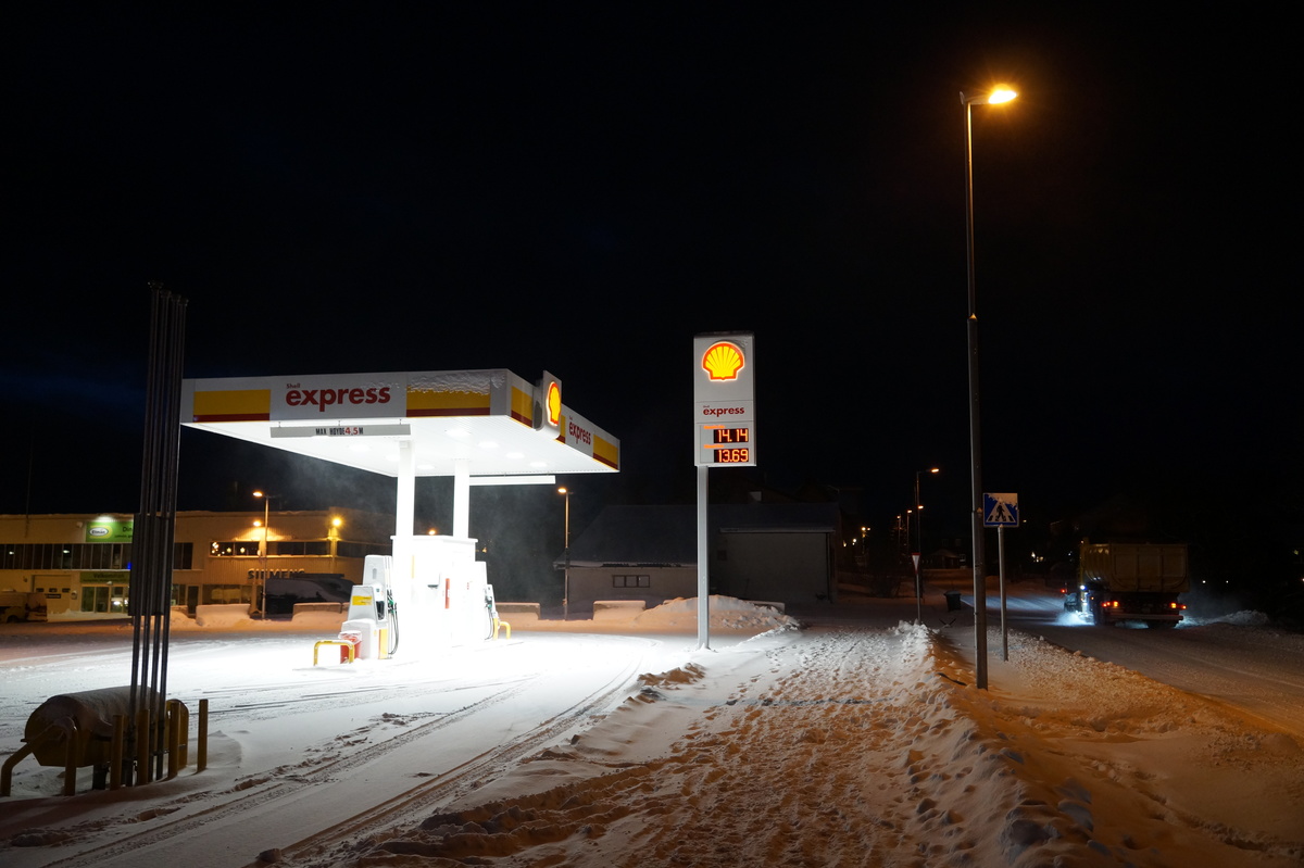 Polarlichter? Leider keine. Ein paar wenige aus unserer Gruppe hatten eine zusätzliche Bustour in die Nacht gebucht und waren tatsächlich erfolgreich (irgendwo hinter der Grenze nach Finnland), aber für die weit überwiegende Zahl der übrigen Teilnehmer hieß es: Schneefall, Schneefall, Wolken, Wolken. Und wenn mal die Wolken weg waren, war nichts zu sehen. Ich probierte ein paar Testaufnahmen mit langer Belichtung, aber es war ein reines Blau zu sehen- zwischen orange Wolken.