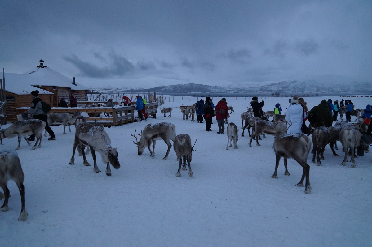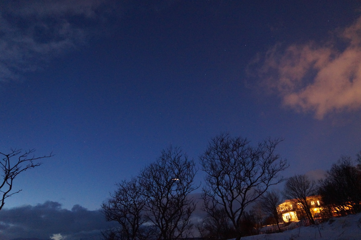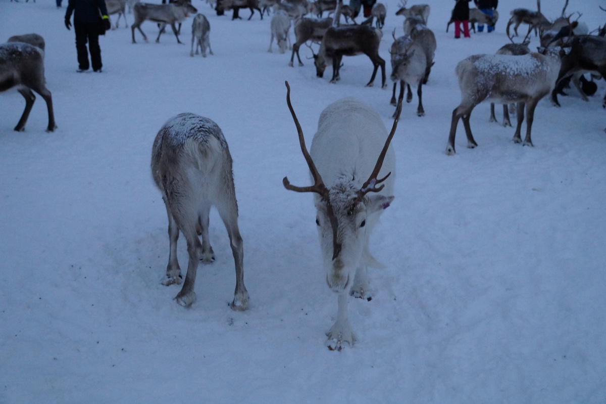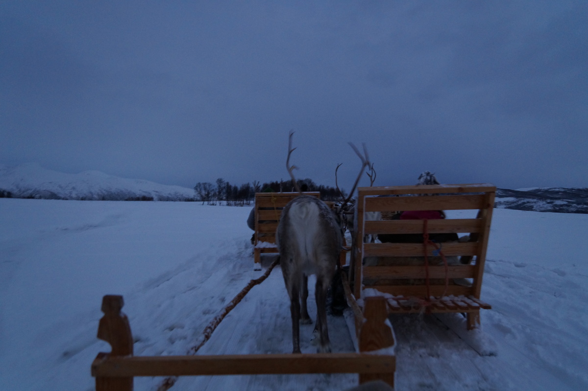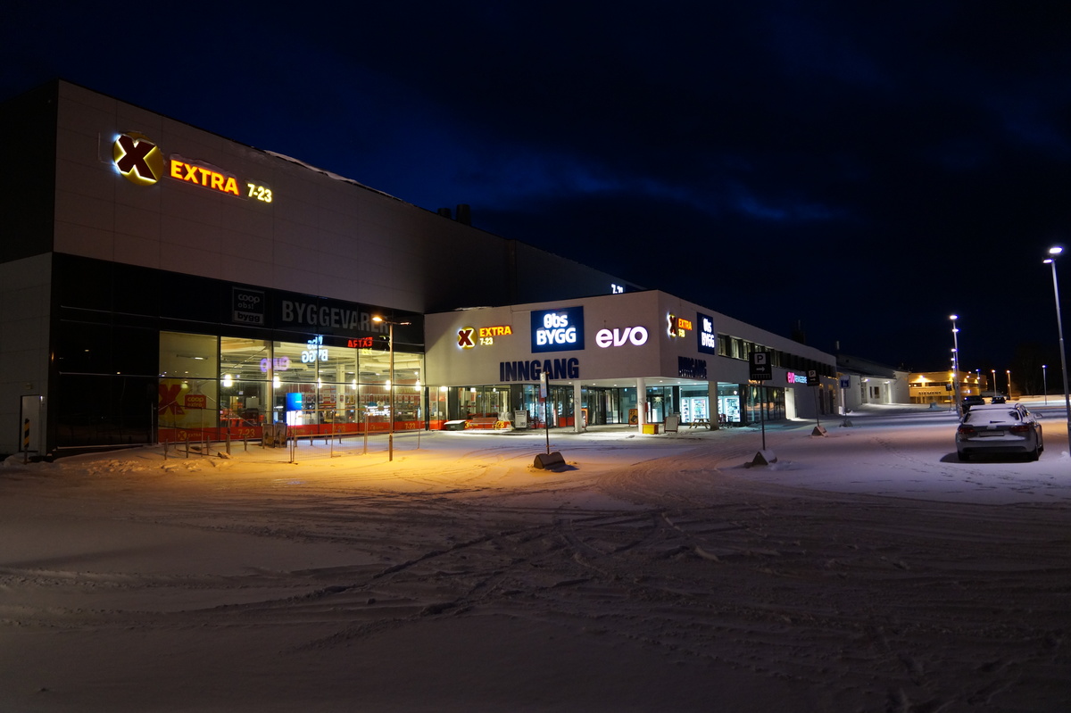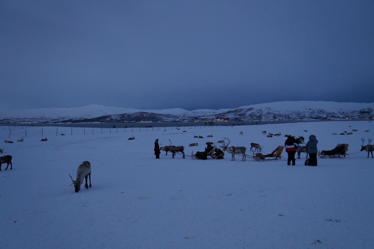 Polarlichter? Leider keine. Ein paar wenige aus unserer Gruppe hatten eine zusätzliche Bustour in die Nacht gebucht und waren tatsächlich erfolgreich (irgendwo hinter der Grenze nach Finnland), aber für die weit überwiegende Zahl der übrigen Teilnehmer hieß es: Schneefall, Schneefall, Wolken, Wolken. Und wenn mal die Wolken weg waren, war nichts zu sehen. Ich probierte ein paar Testaufnahmen mit langer Belichtung, aber es war ein reines Blau zu sehen- zwischen orange Wolken.
