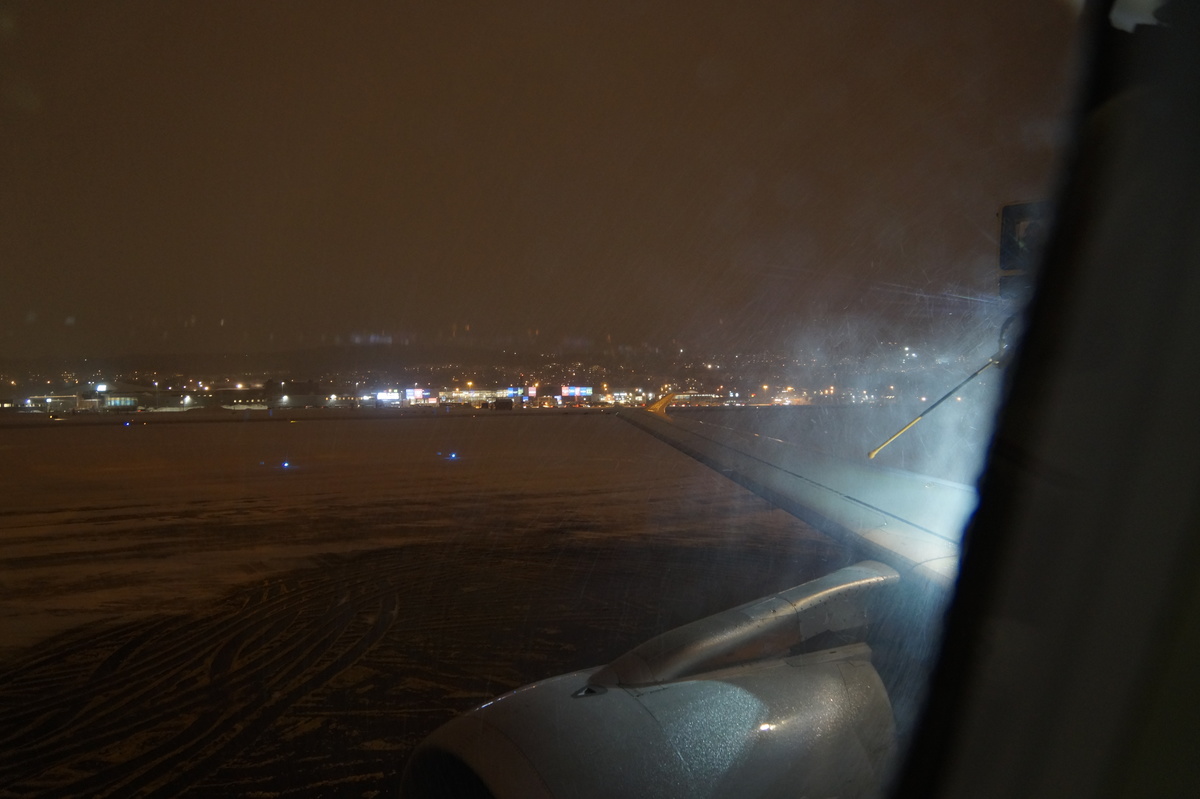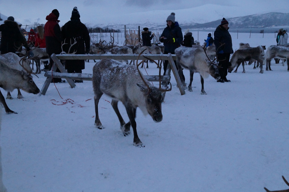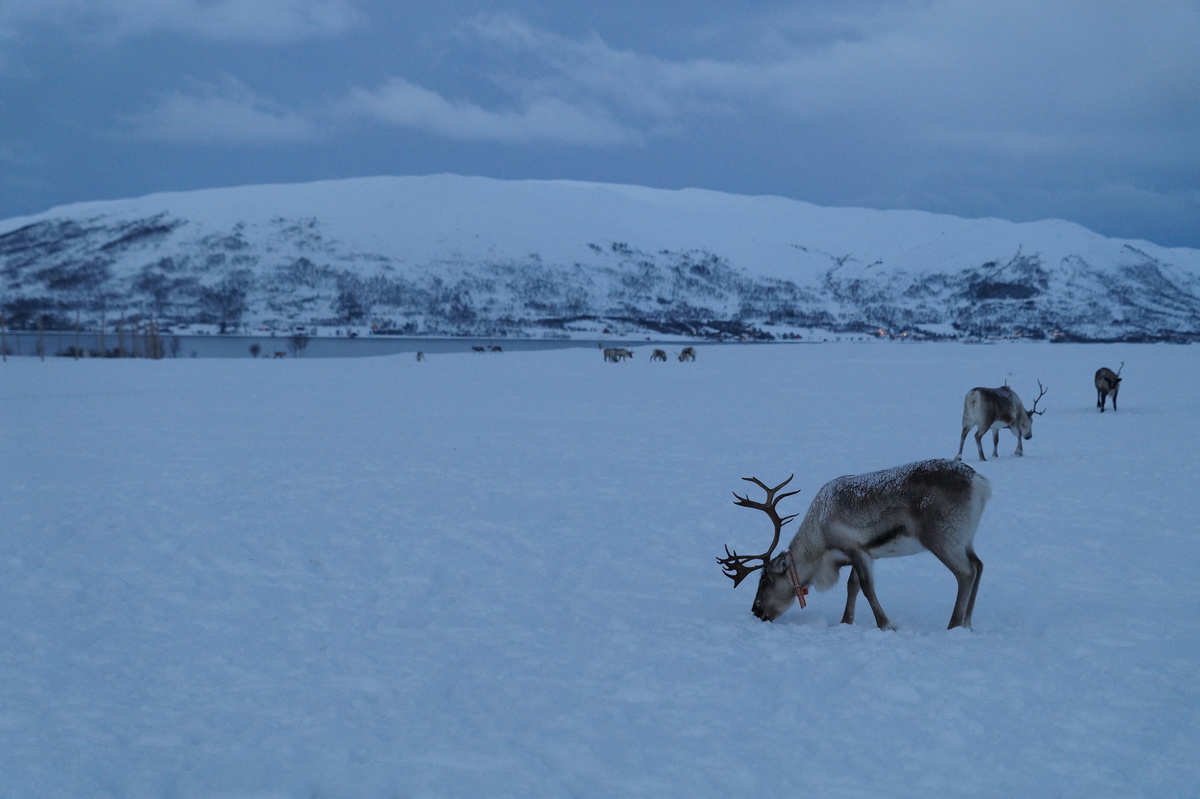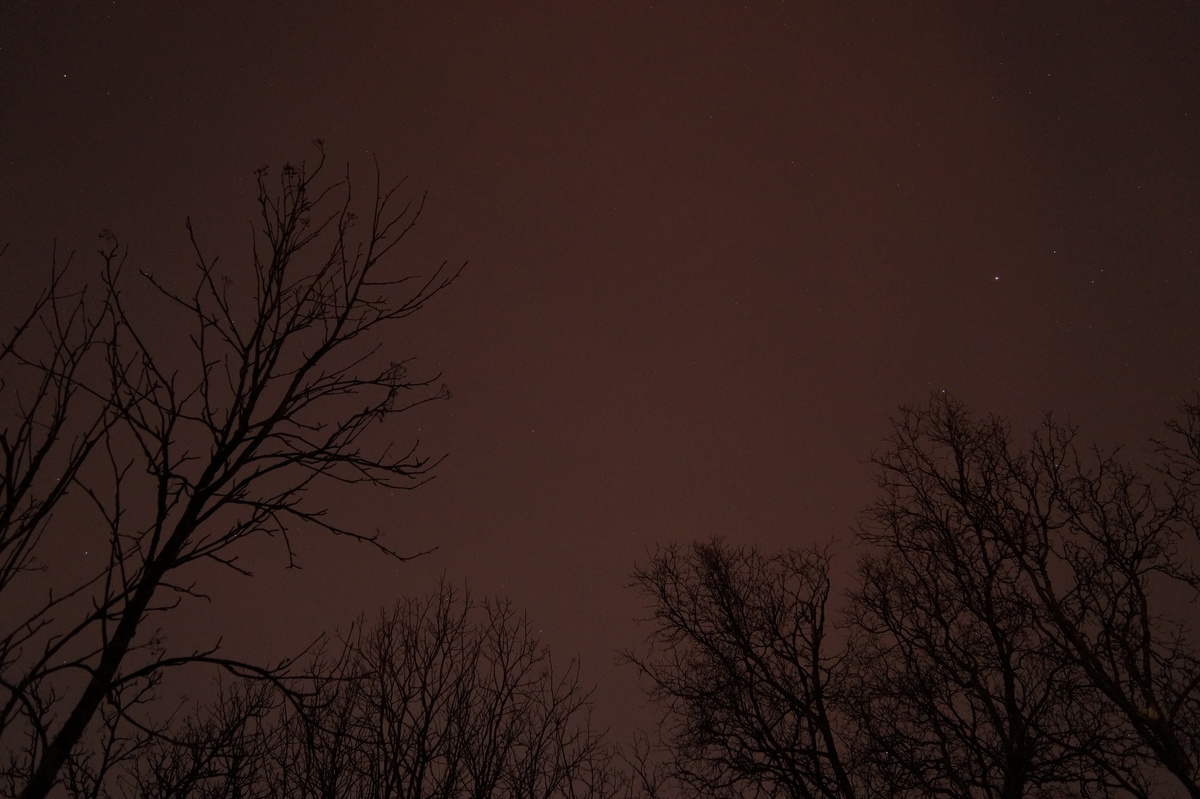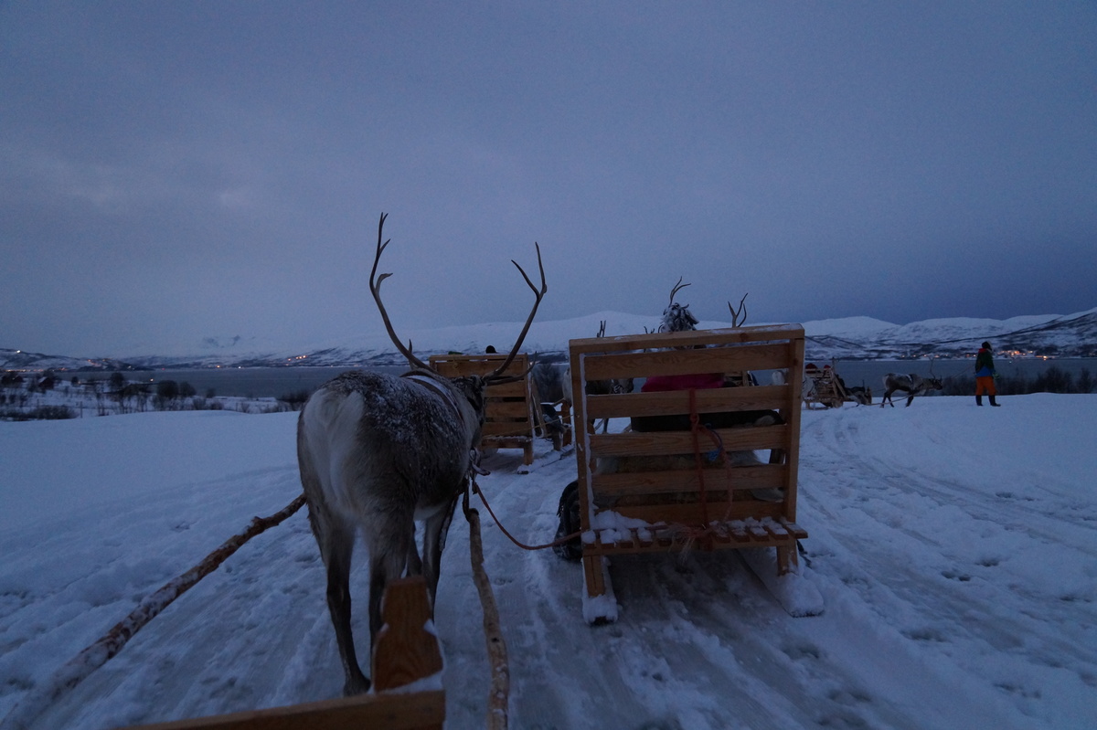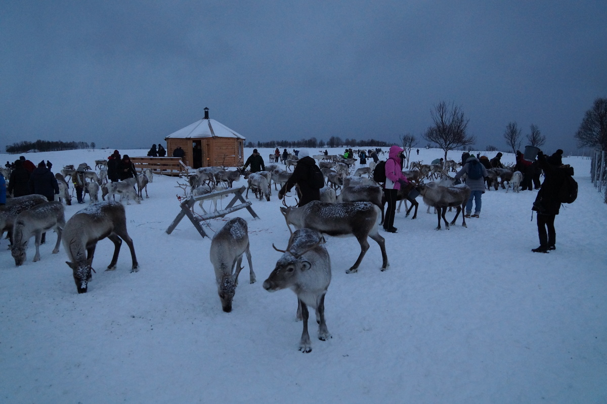Polarlichter? Leider keine. Ein paar wenige aus unserer Gruppe hatten eine zusätzliche Bustour in die Nacht gebucht und waren tatsächlich erfolgreich (irgendwo hinter der Grenze nach Finnland), aber für die weit überwiegende Zahl der übrigen Teilnehmer hieß es: Schneefall, Schneefall, Wolken, Wolken. Und wenn mal die Wolken weg waren, war nichts zu sehen. Ich probierte ein paar Testaufnahmen mit langer Belichtung, aber es war ein reines Blau zu sehen- zwischen orange Wolken.