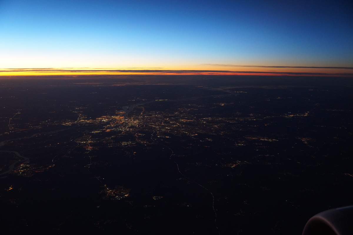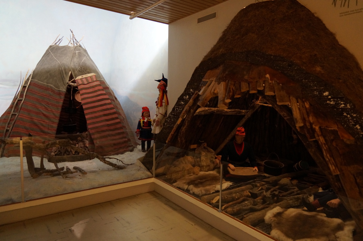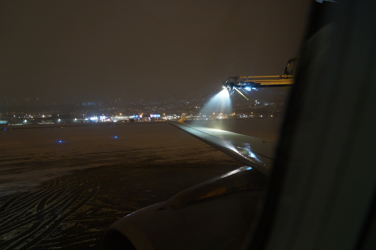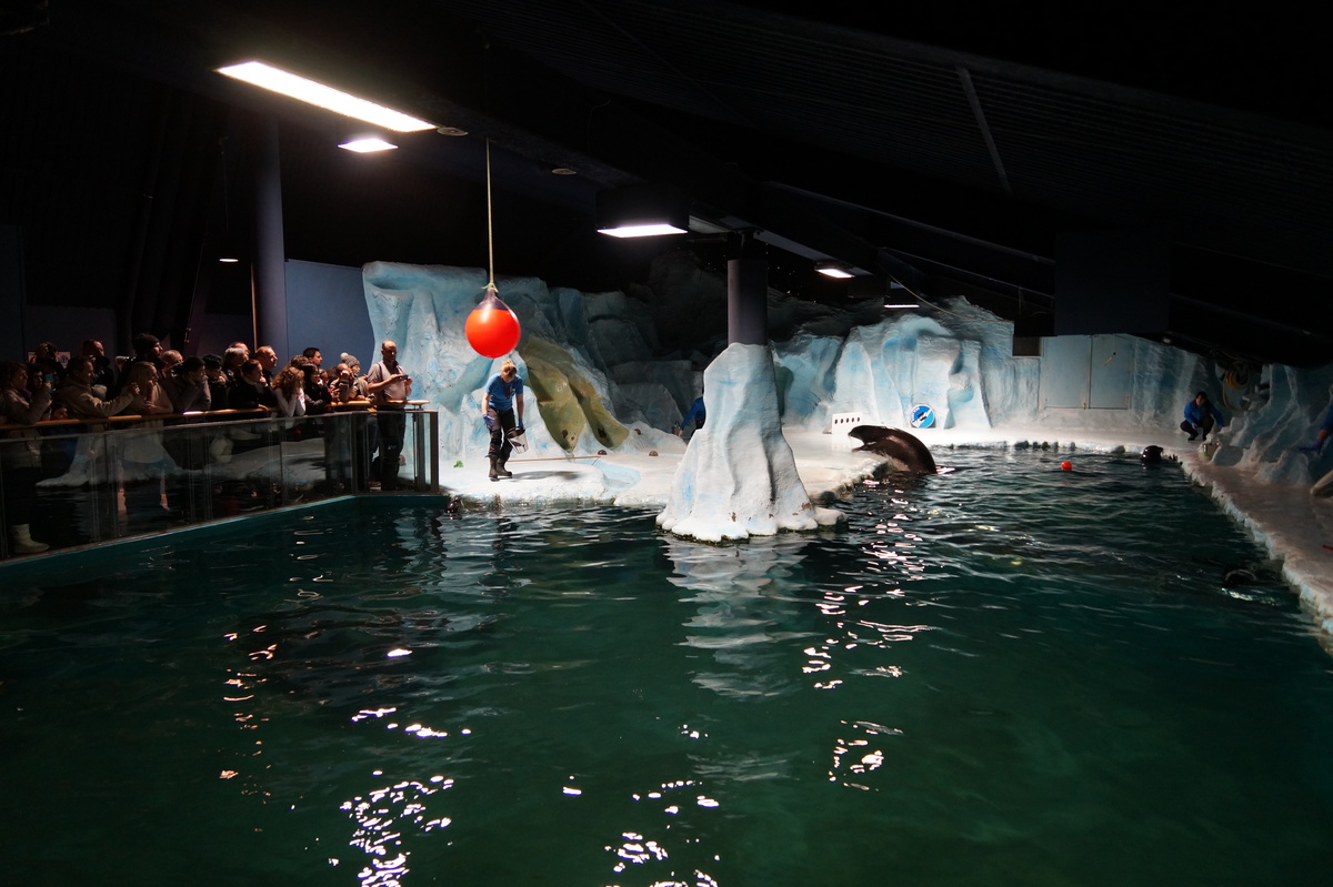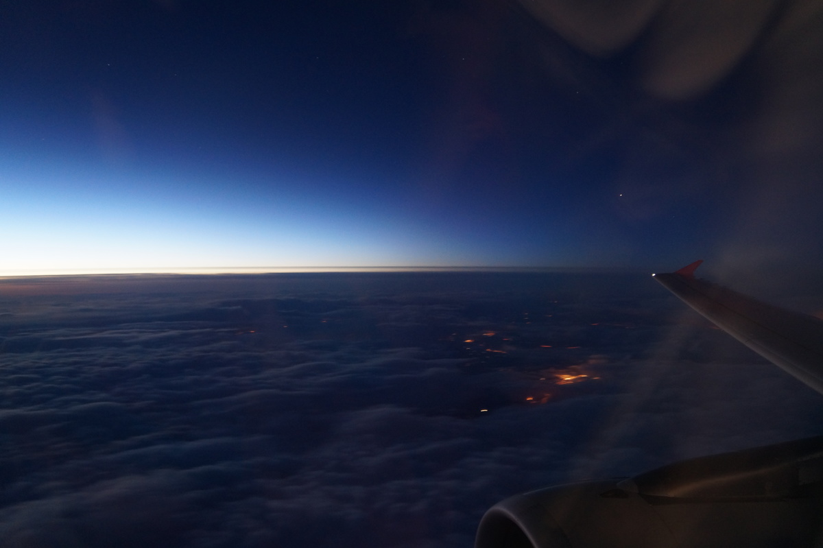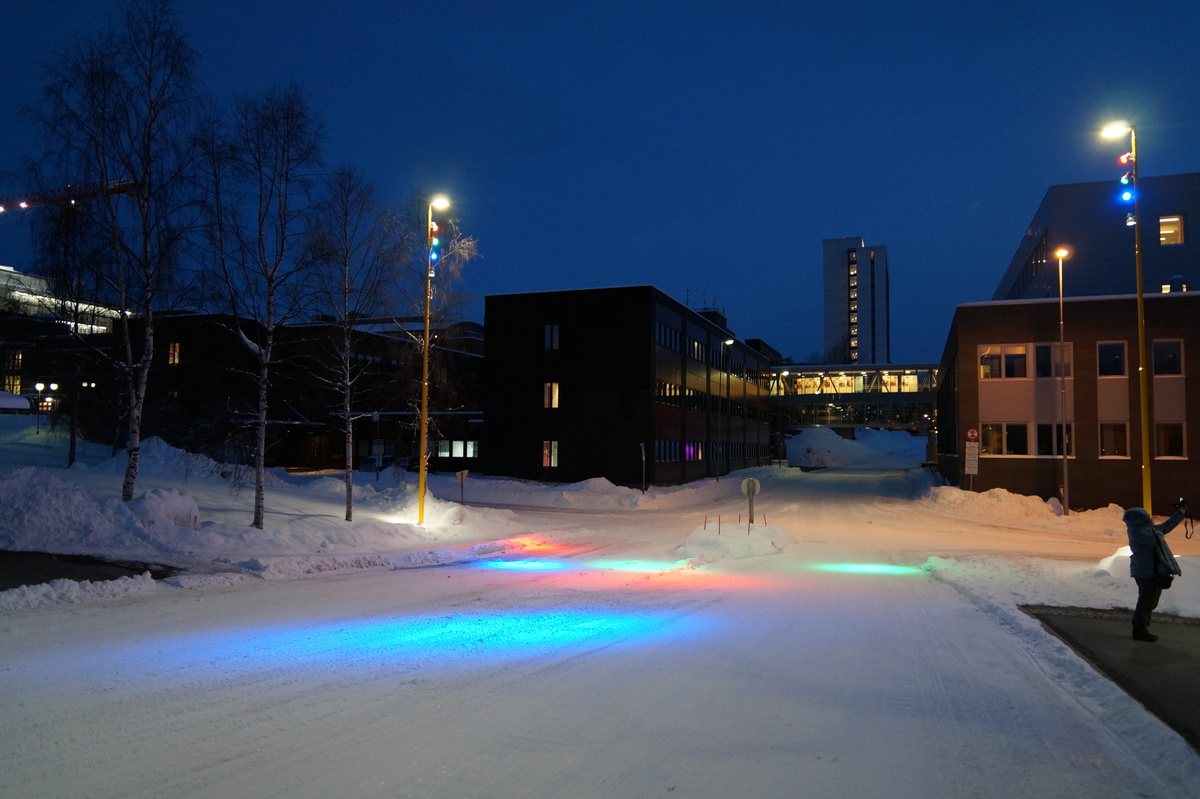 Polarlichter? Leider keine. Ein paar wenige aus unserer Gruppe hatten eine zusätzliche Bustour in die Nacht gebucht und waren tatsächlich erfolgreich (irgendwo hinter der Grenze nach Finnland), aber für die weit überwiegende Zahl der übrigen Teilnehmer hieß es: Schneefall, Schneefall, Wolken, Wolken. Und wenn mal die Wolken weg waren, war nichts zu sehen. Ich probierte ein paar Testaufnahmen mit langer Belichtung, aber es war ein reines Blau zu sehen- zwischen orange Wolken.