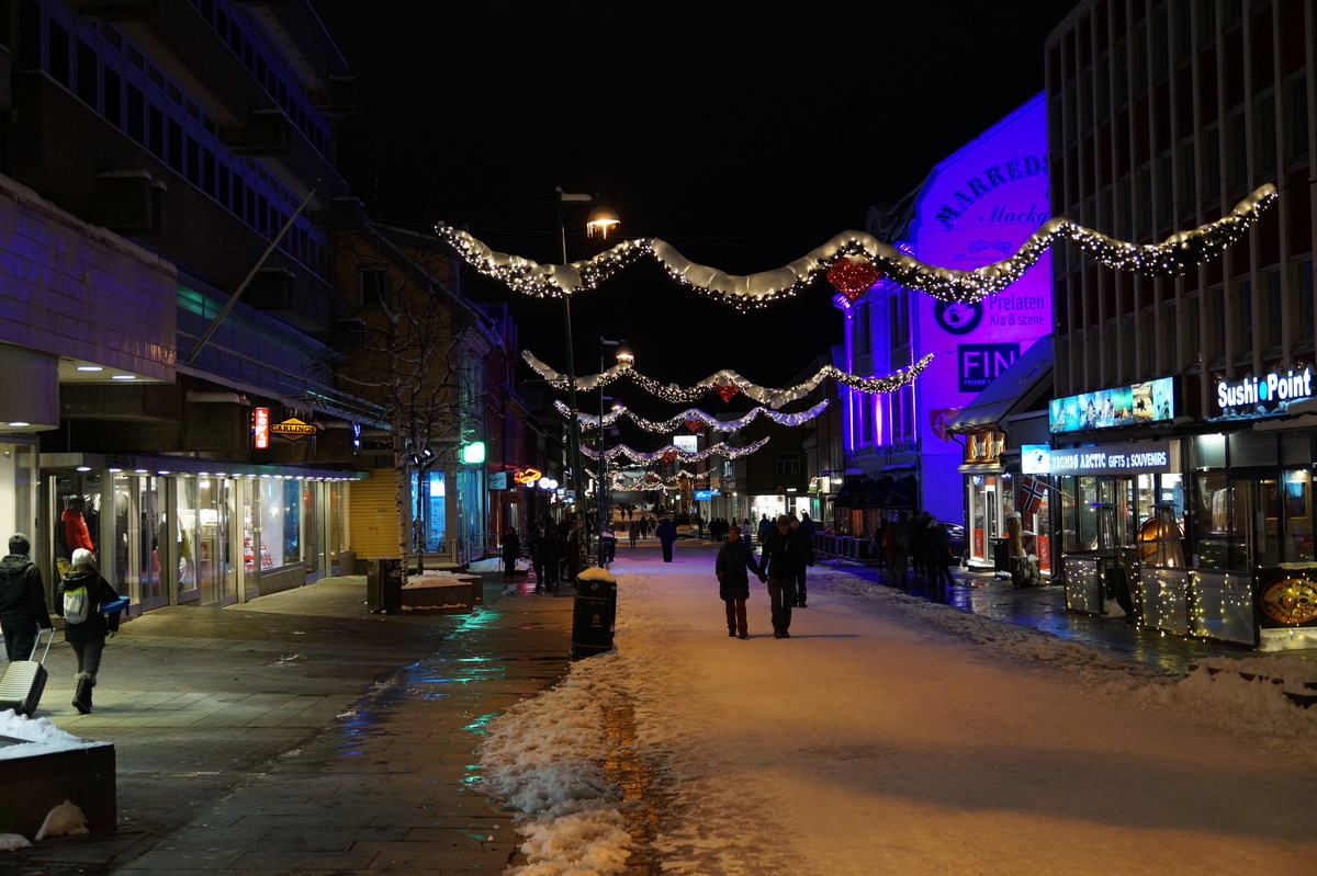 Ganz besonders war ich auf die Polarnacht gespannt, die nun noch eindrucksvoller sein sollte, da wir drei Wochen näher am Winteranfang sind. Und ich bin nicht enttäuscht worden - gerade mit den Weihnachtsdekorationen wirkt diese Stadt gerade so wie die Elfenstadt am Nordpol im Animationsfilm "Der Polarexpress". Es fehlt eigentlich nur der riesige Tannenbaum in der Mitte und der Weihnachtsmann.
