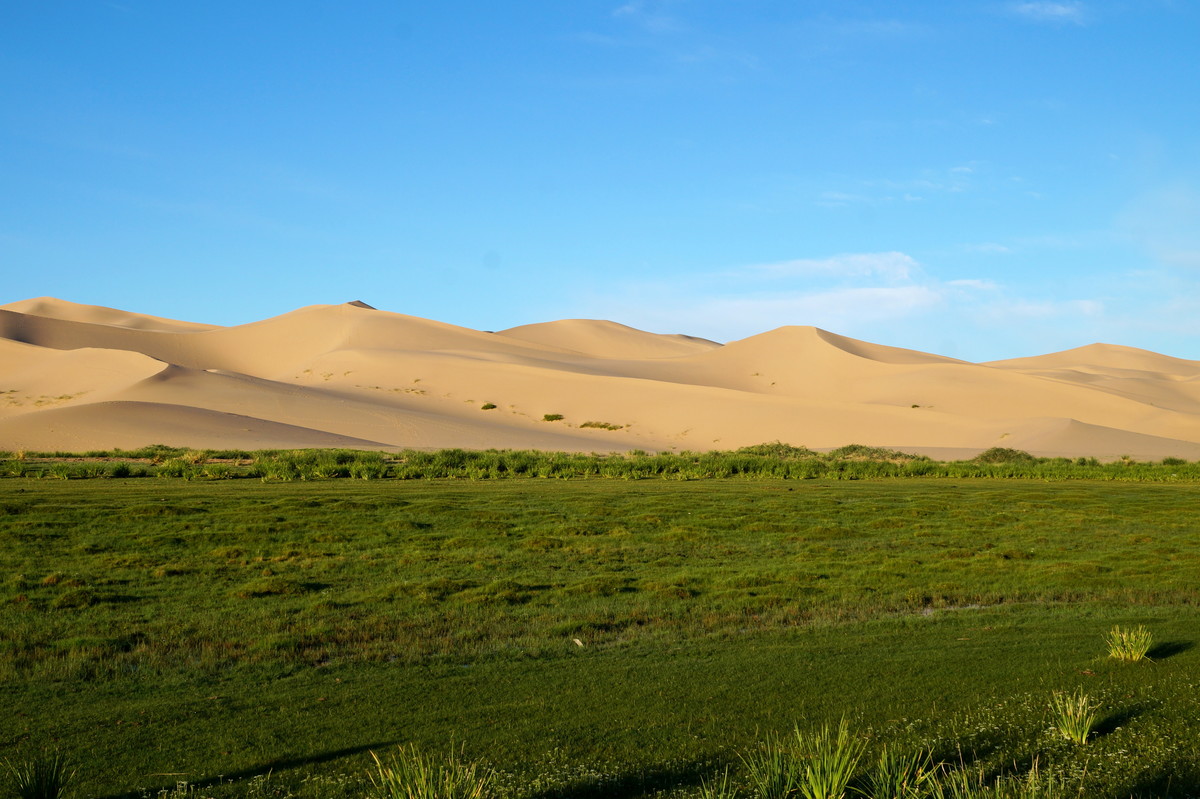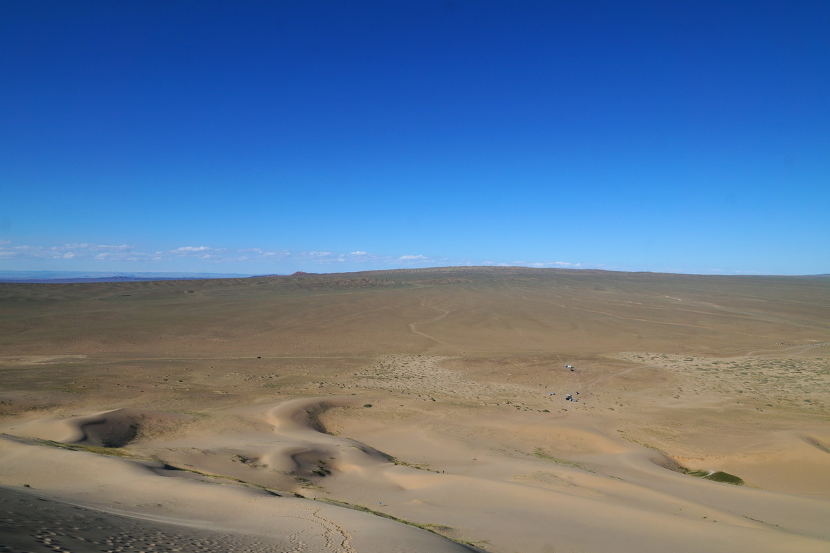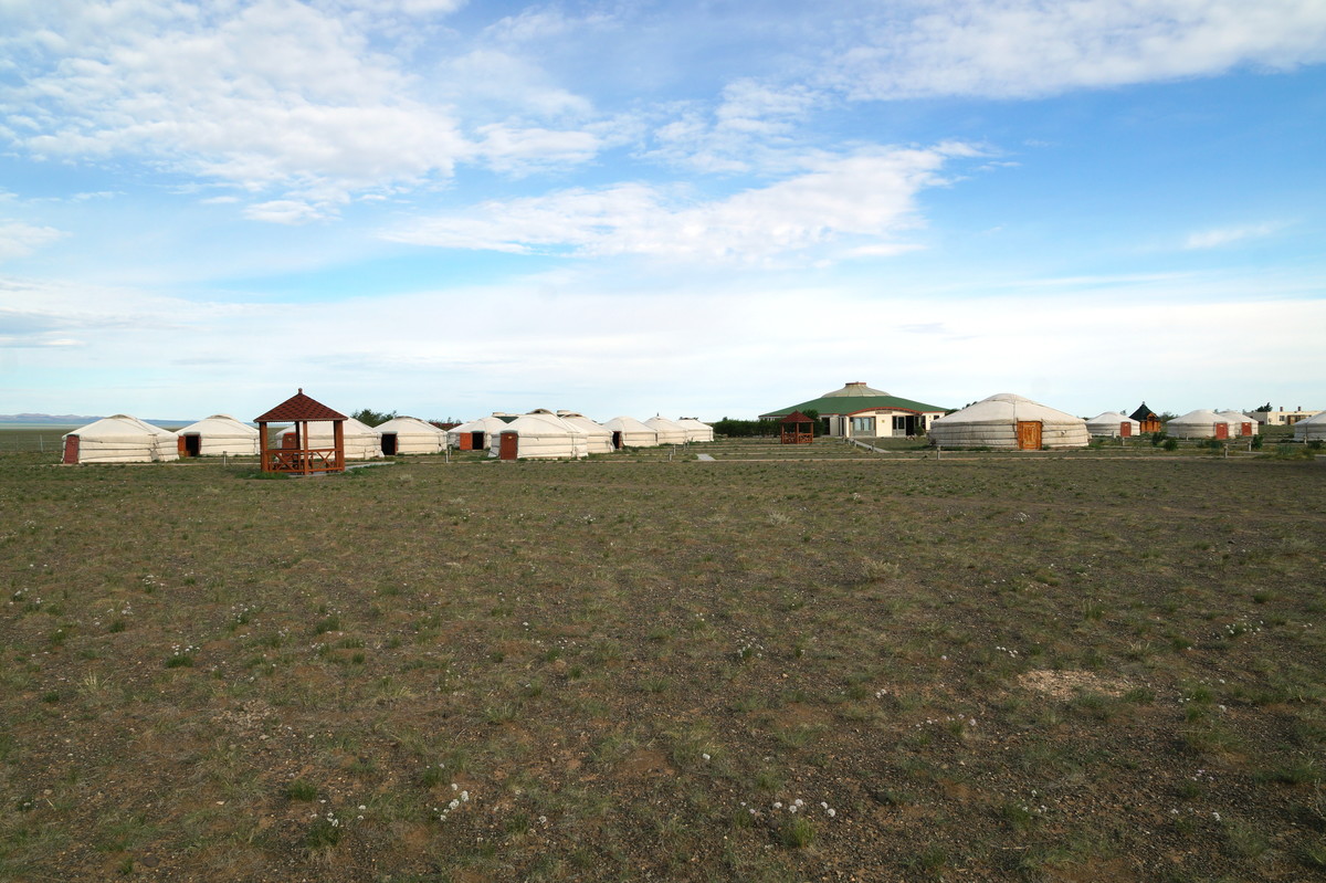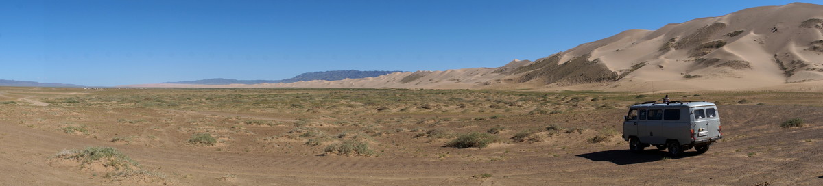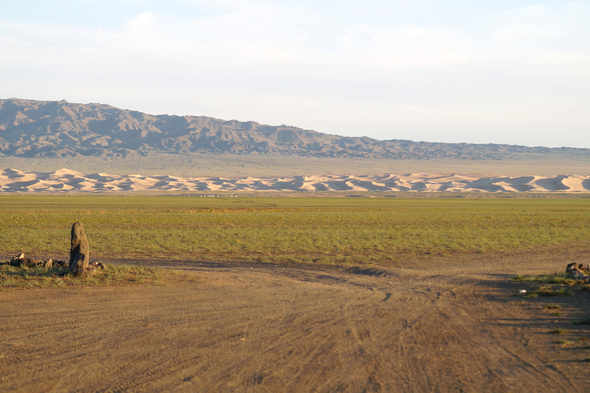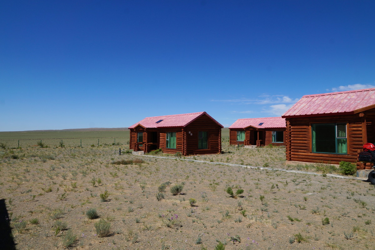 Khongoryn Els. Es geht westwärts durch die Gobi - bei 25 Grad im Schatten. In der Ferne taucht die Khongoryn Els auf - ein 100 Kilometer langes Sanddünenfeld. Das Camp Gov' Erdene (Schatz der Gobi) bietet uns eine nicht erwartete Abwechslung: Blockhütten. Und eine eigene Toilette.