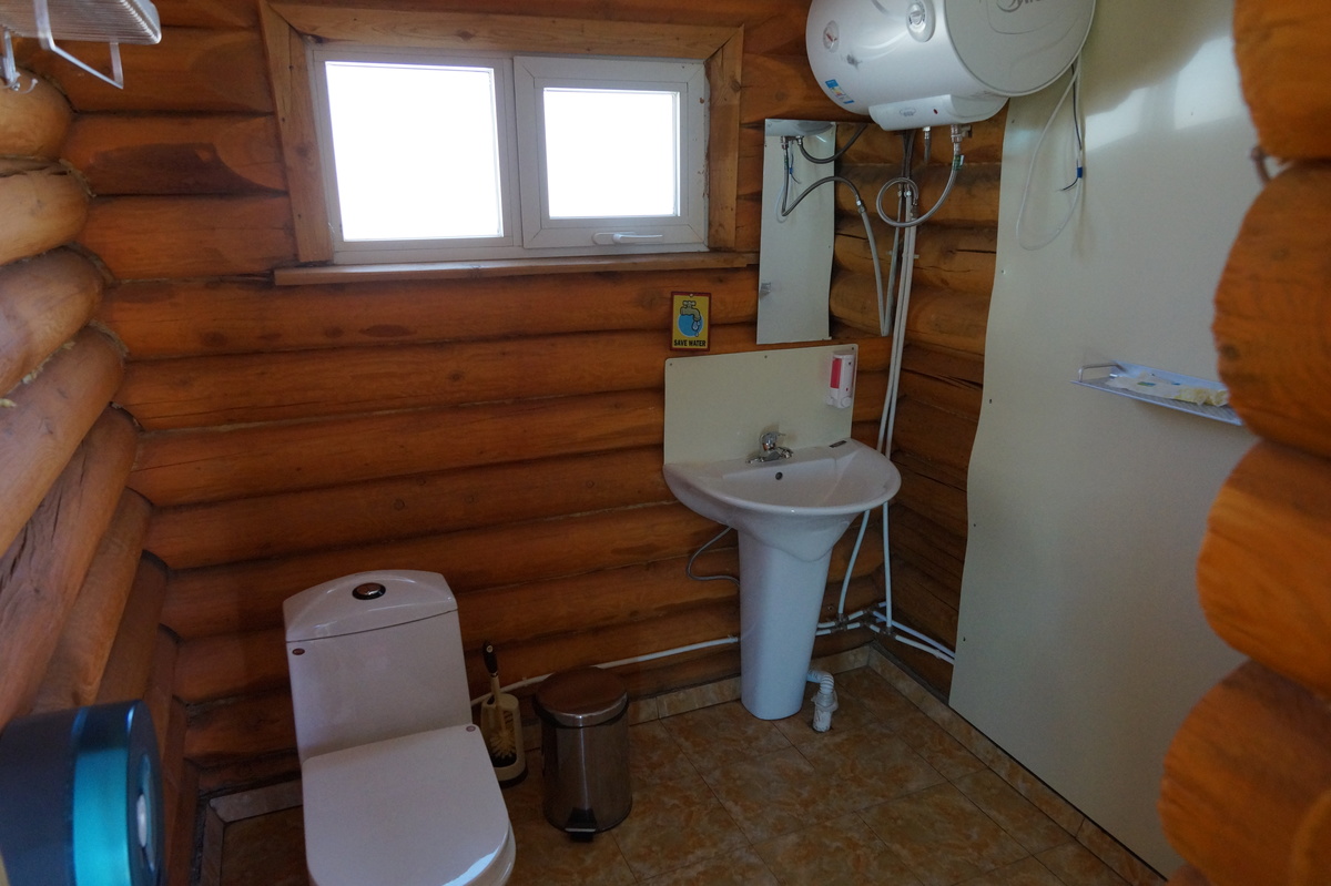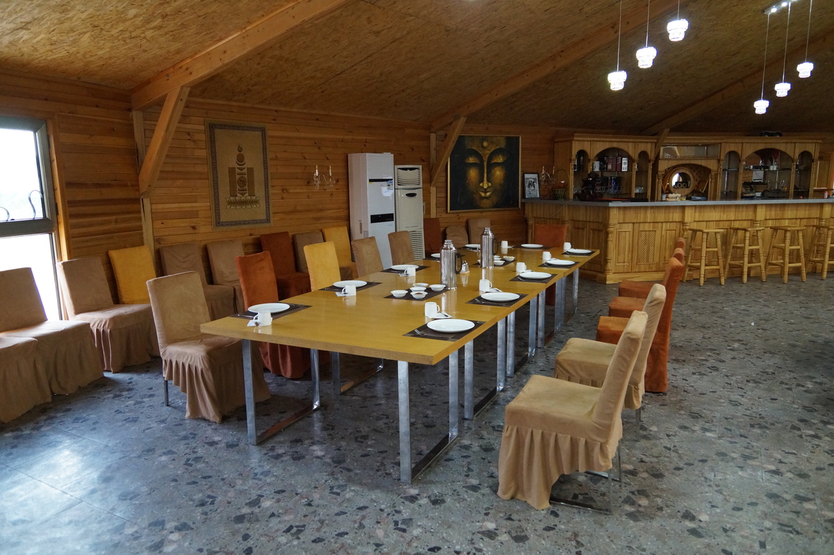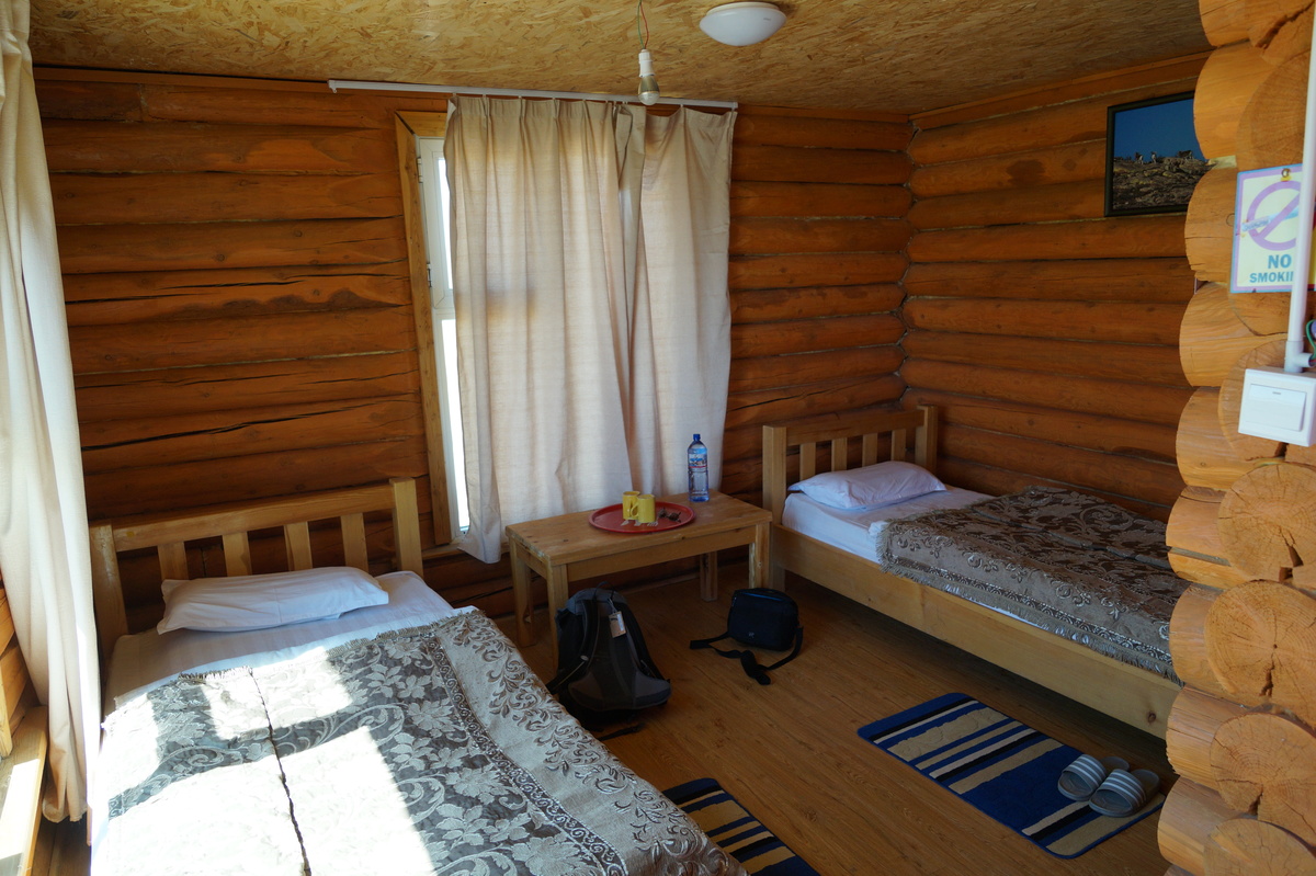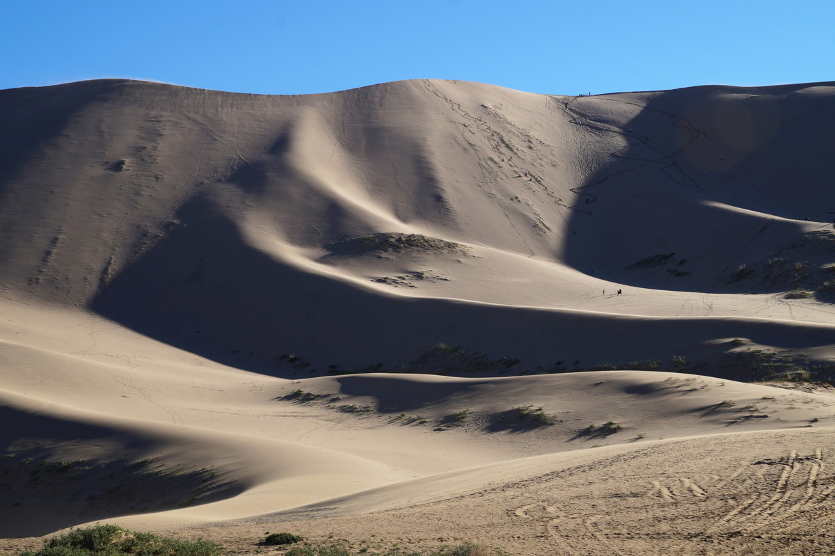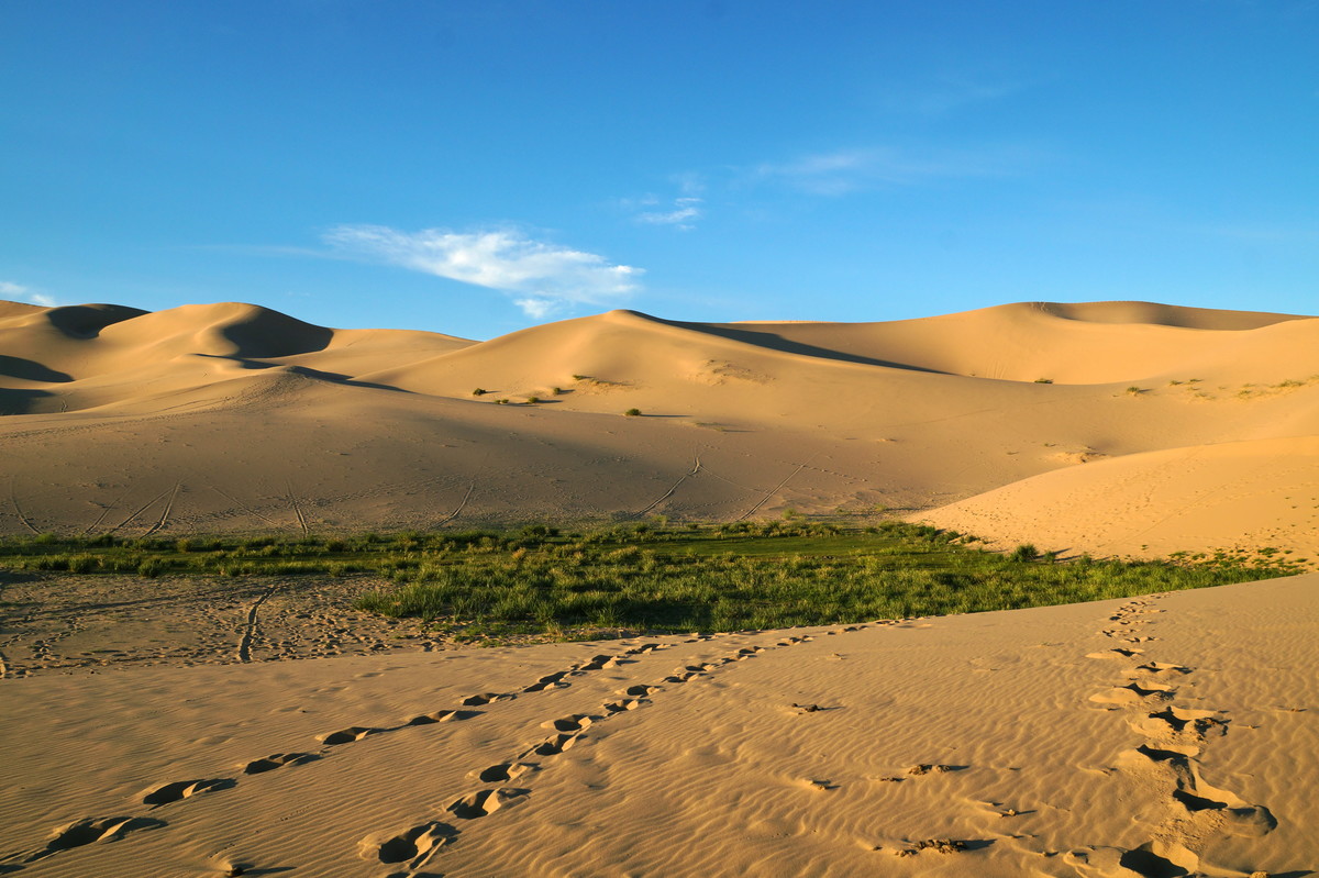 Khongoryn Els. Es geht westwärts durch die Gobi - bei 25 Grad im Schatten. In der Ferne taucht die Khongoryn Els auf - ein 100 Kilometer langes Sanddünenfeld. Das Camp Gov' Erdene (Schatz der Gobi) bietet uns eine nicht erwartete Abwechslung: Blockhütten. Und eine eigene Toilette.