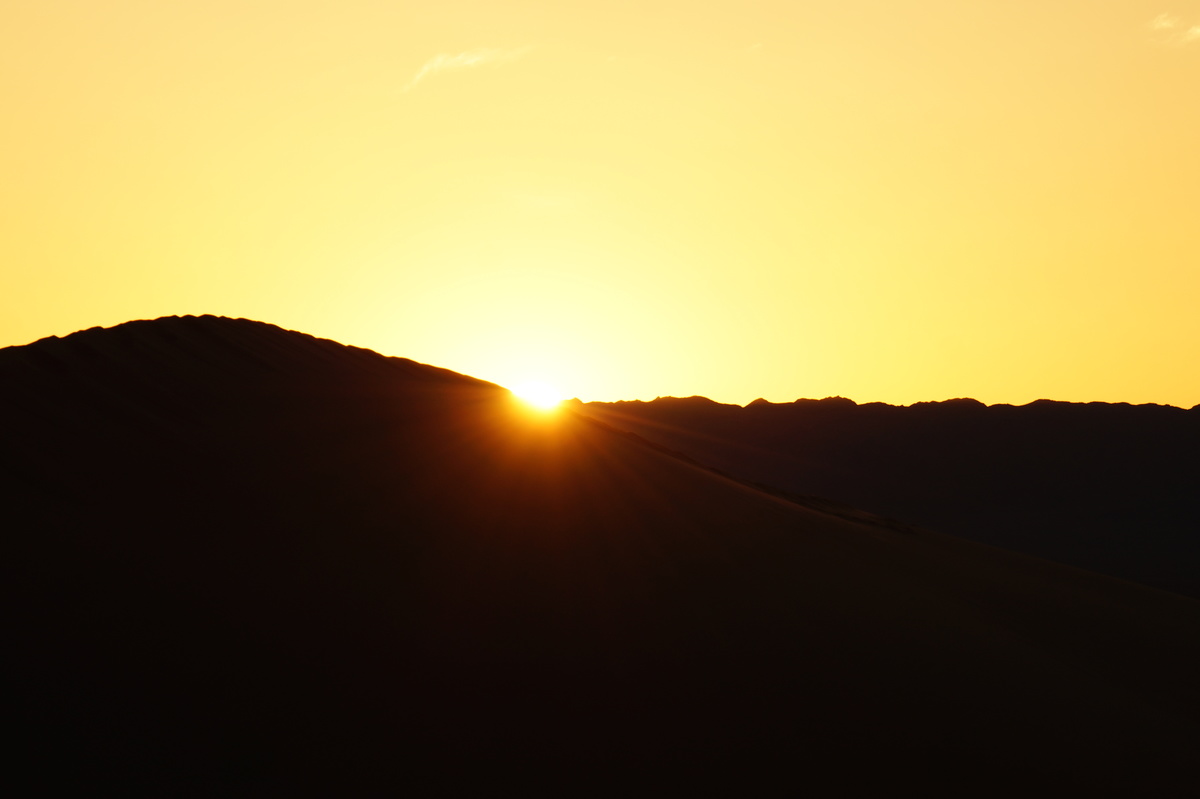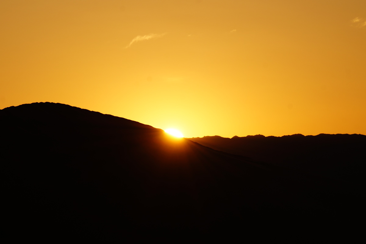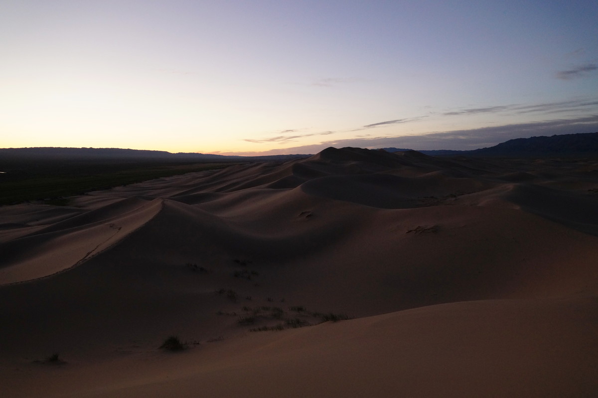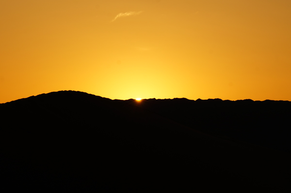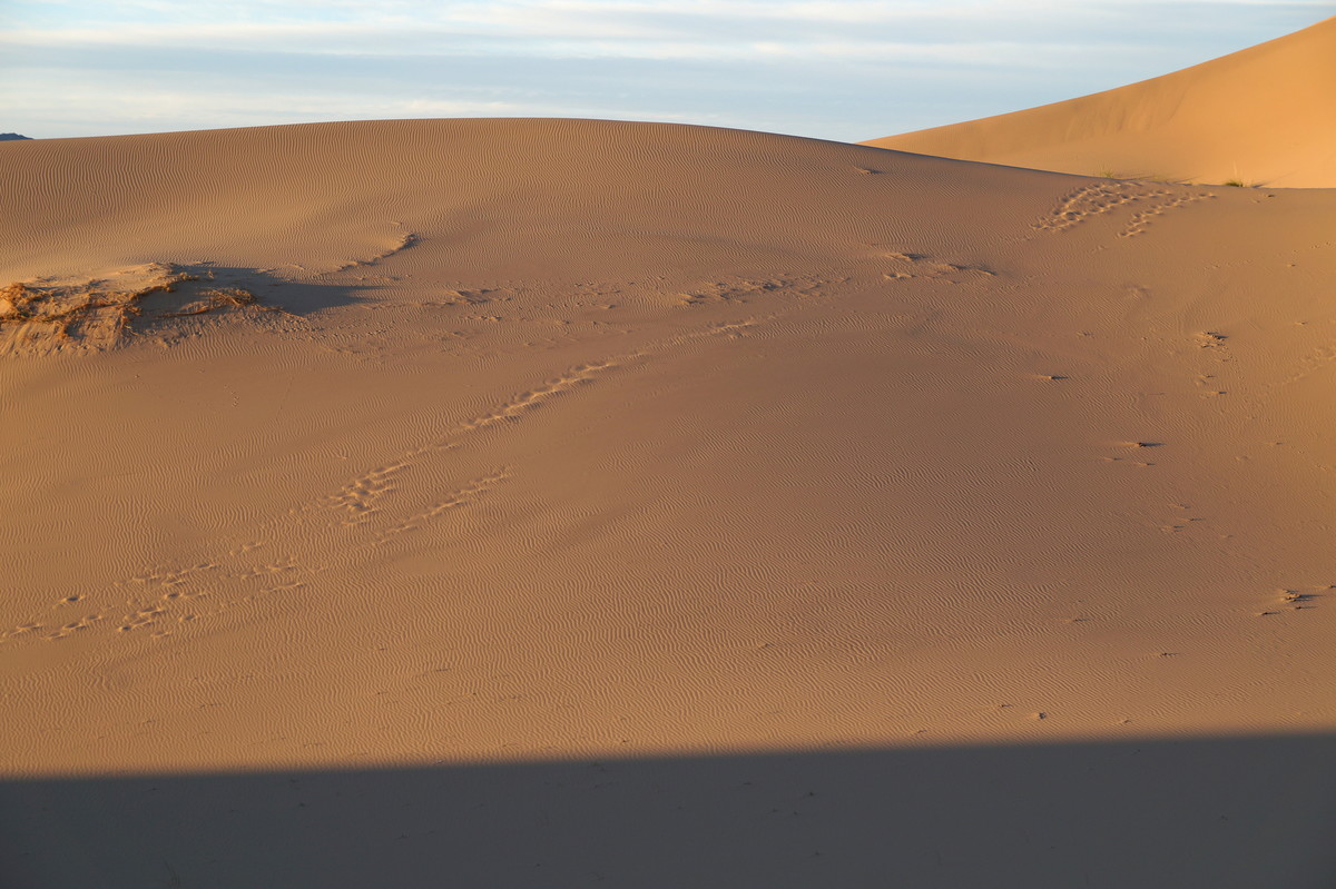 Am frühen Morgen (also, wirklich früh, Aufstehen um halb 5) geht es raus in die Dünen, denn wir wollen den Sonnenaufgang miterleben. Und es ist unglaublich, was die Natur uns bietet - das Farbenspiel über dem Sand, die sanften Kräuselungen, der Sand, der im Gegenlicht fast wie Schnee aussieht.