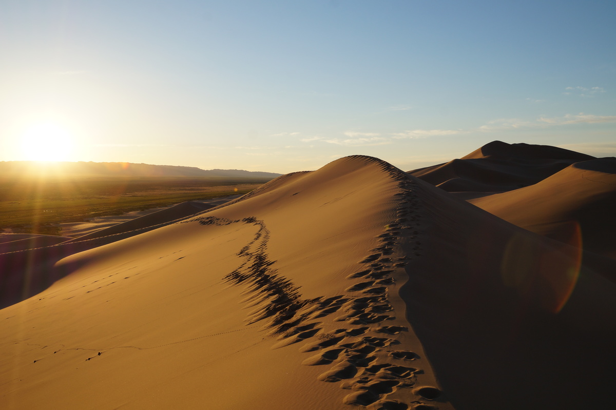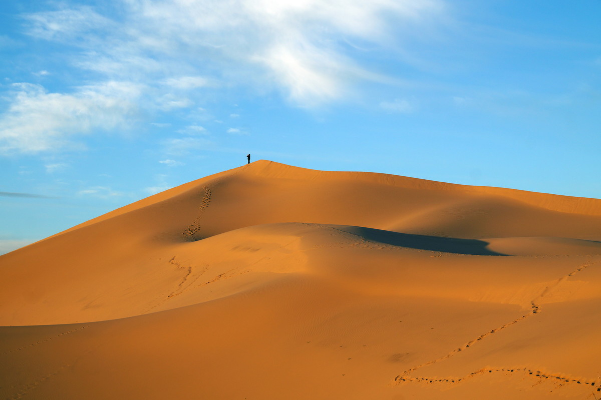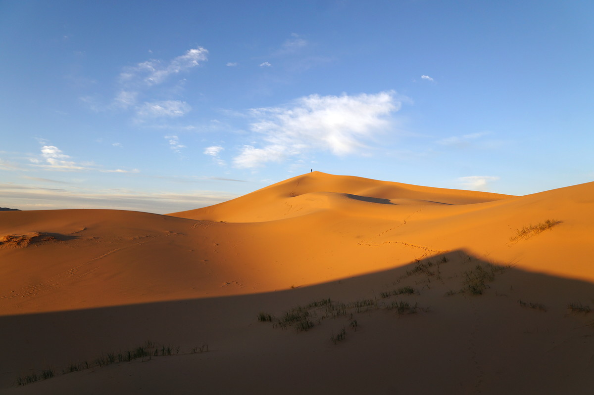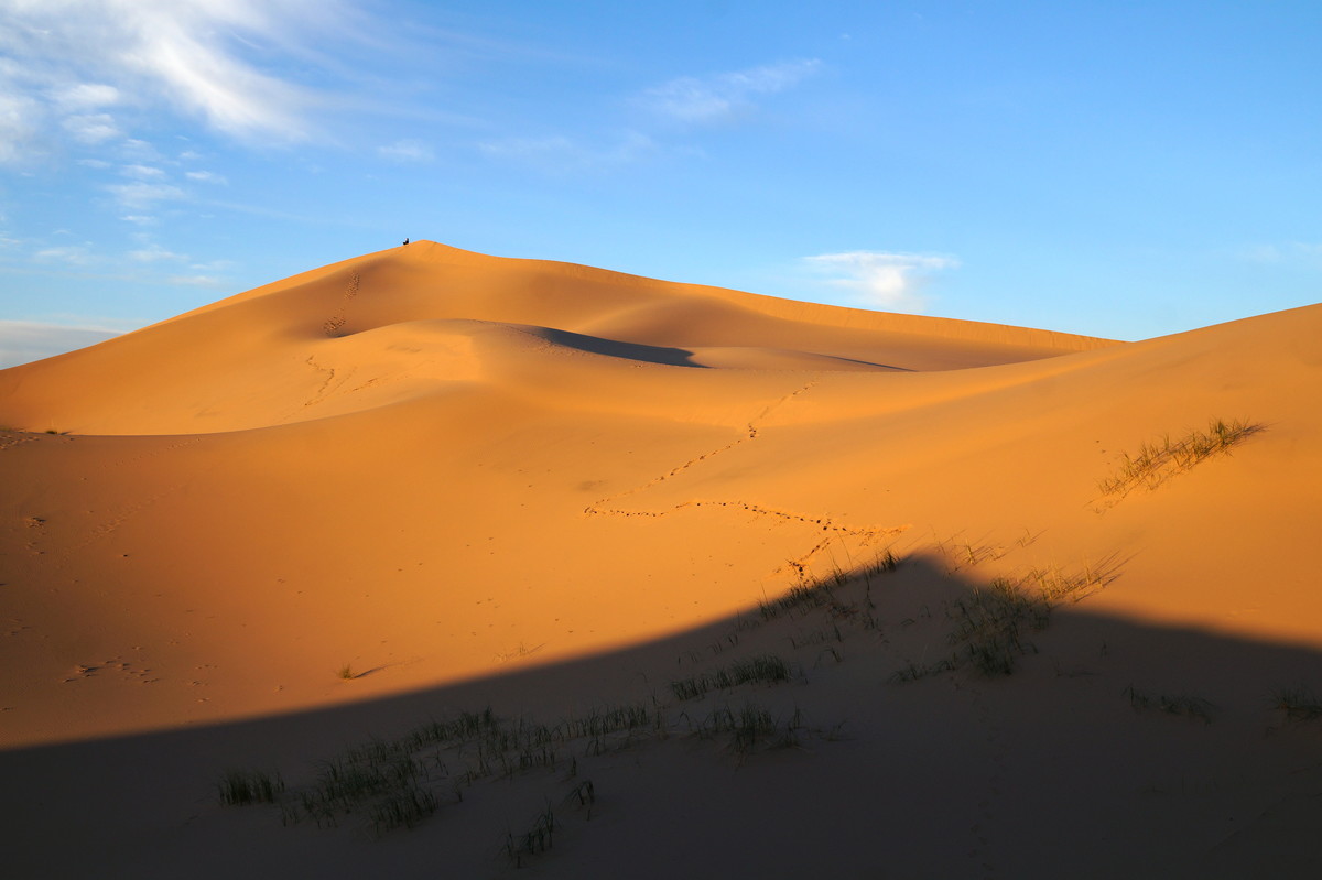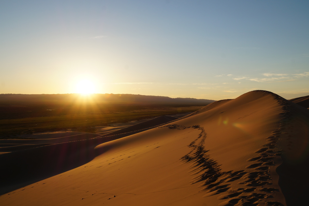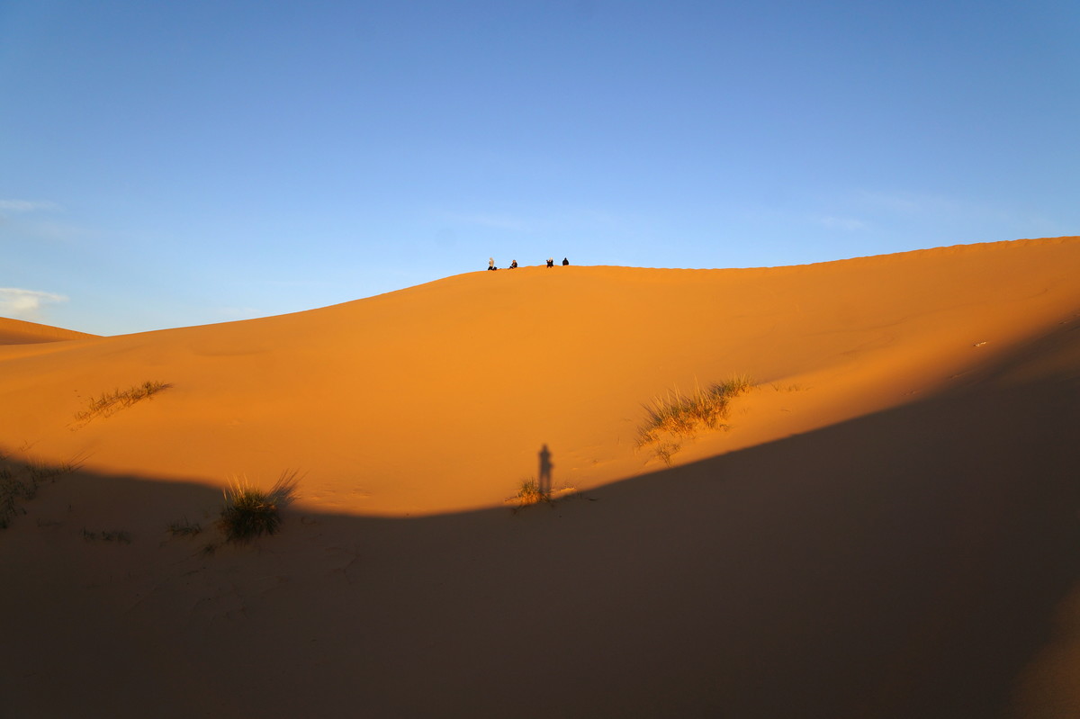 Am frühen Morgen (also, wirklich früh, Aufstehen um halb 5) geht es raus in die Dünen, denn wir wollen den Sonnenaufgang miterleben. Und es ist unglaublich, was die Natur uns bietet - das Farbenspiel über dem Sand, die sanften Kräuselungen, der Sand, der im Gegenlicht fast wie Schnee aussieht.