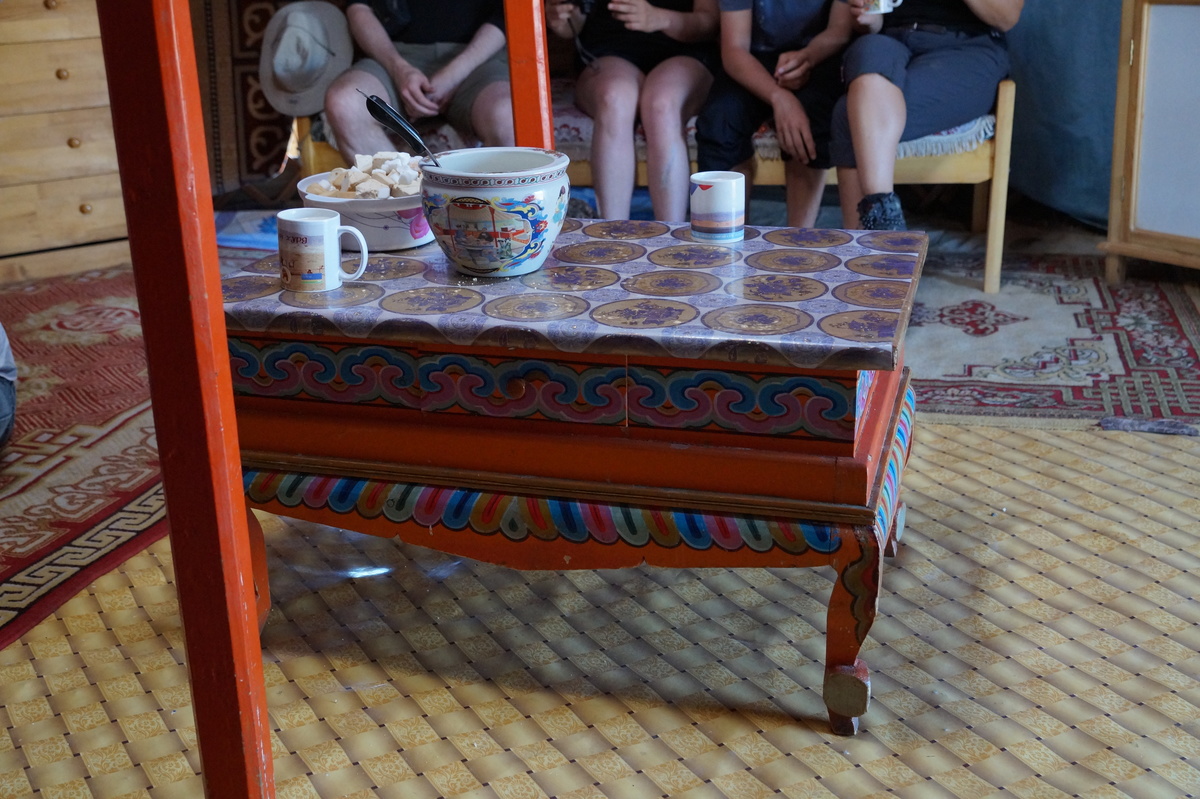 Abend schauen wir ein weiteres Mal bei einer Nomadenfamilie vorbei. Es gibt Schnupftabak, eine Übersicht der vorhandenen Spirituosen, Kamelkäse und Airag.
