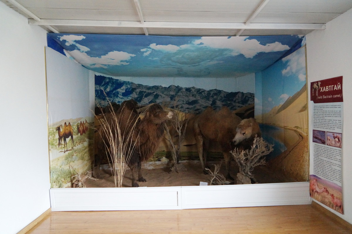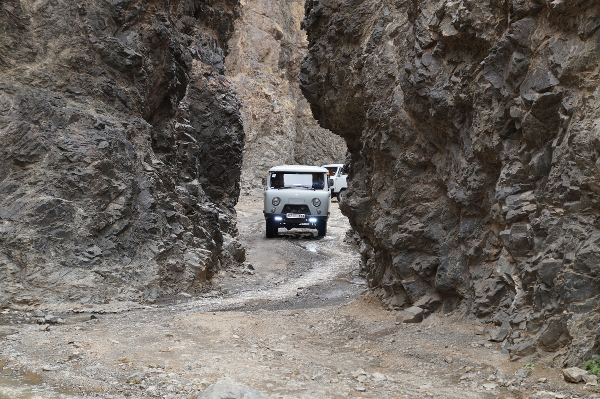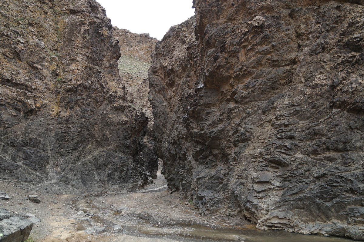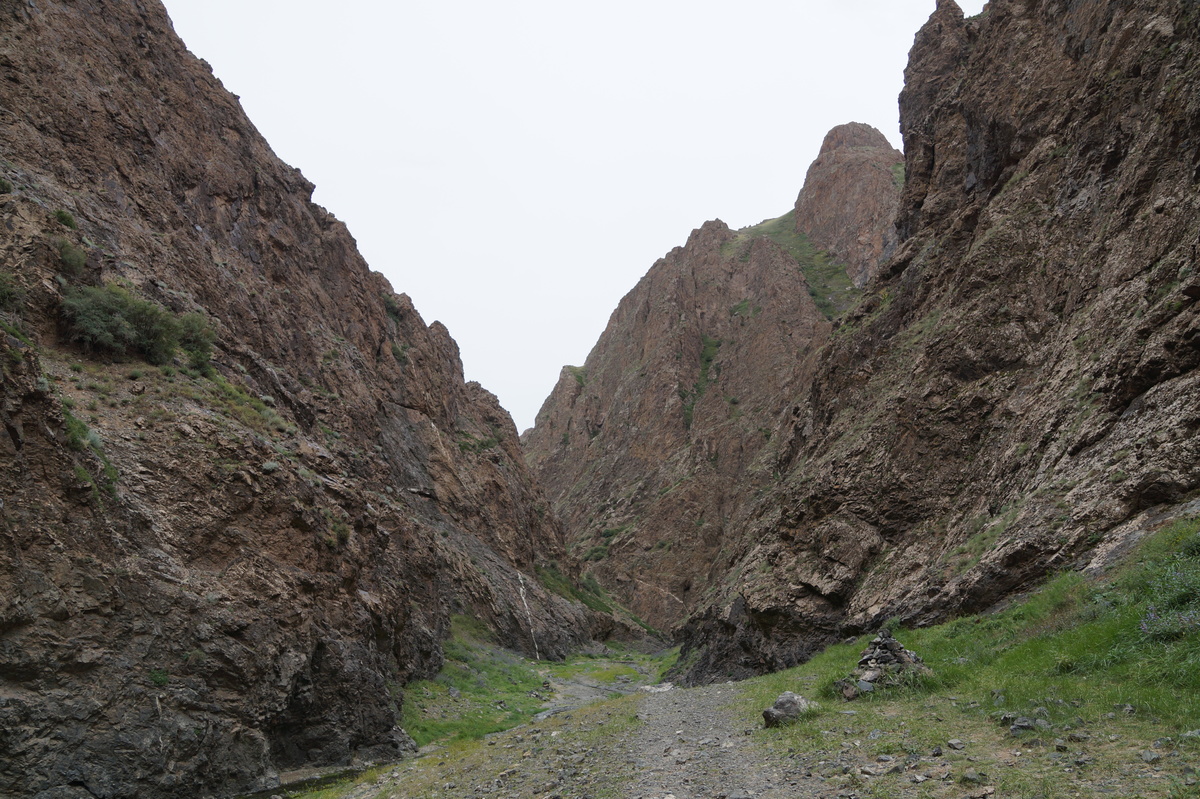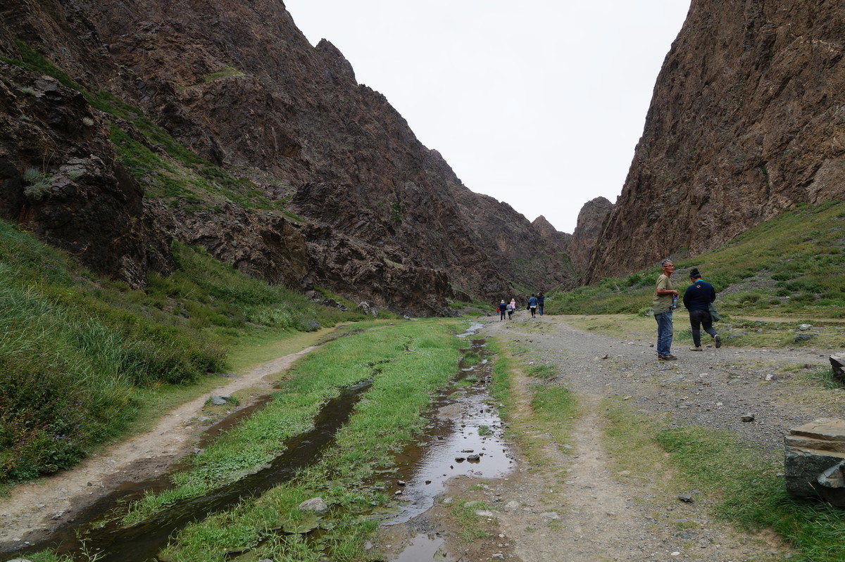 Geierschlucht. Kurz vor drei Uhr nachmittags erreichen wir die Geierschlucht (Yolyn Am). Es wird berichtet, dass der Grund dieser Schlucht nie einen Sonnenstrahl abbekommt, sodass man dort im Sommer Eis finden kann, aber auch hier wirkt sich die globale Klimaerwärmung aus. So kalt ist es tatsächlich nicht; man kann barfuß durch den Bach waten. Im Yolyn-Museum nahe der Hauptstraße kann man sich ein paar ausgestopfte Tiere ansehen.