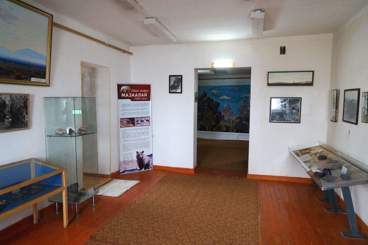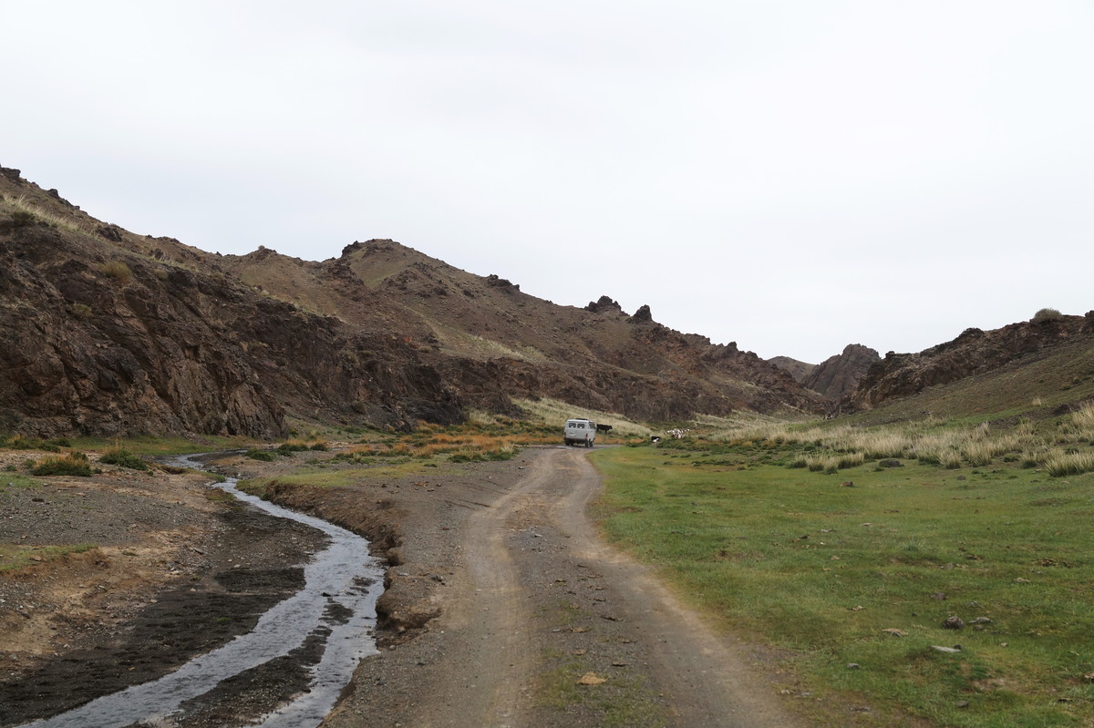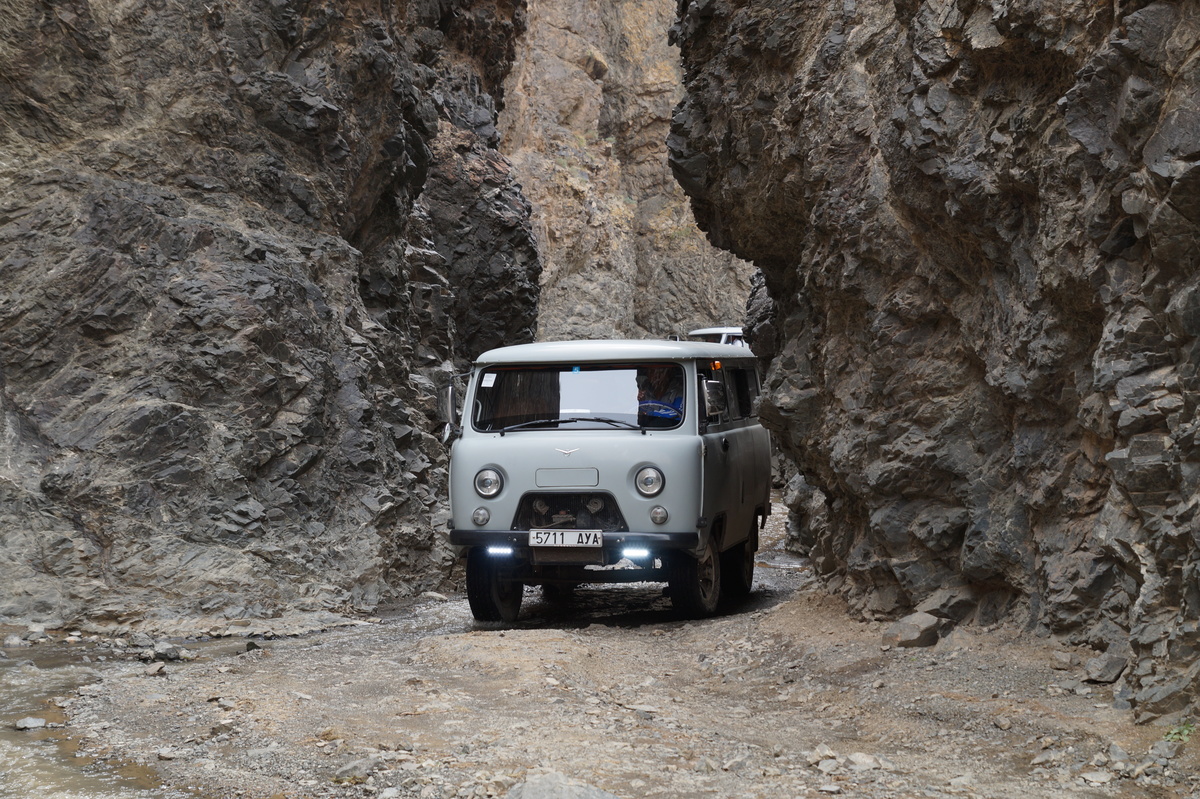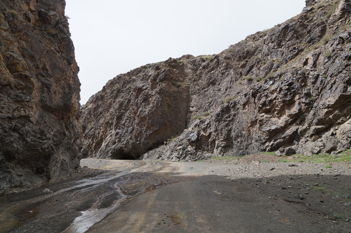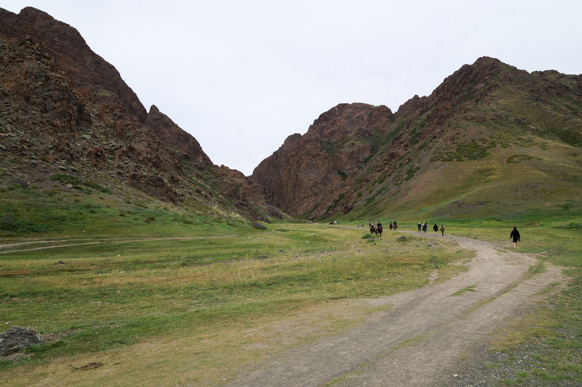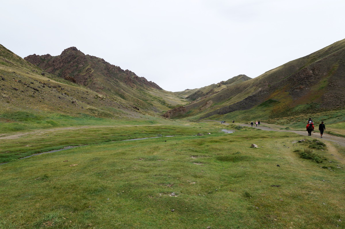Geierschlucht. Kurz vor drei Uhr nachmittags erreichen wir die Geierschlucht (Yolyn Am). Es wird berichtet, dass der Grund dieser Schlucht nie einen Sonnenstrahl abbekommt, sodass man dort im Sommer Eis finden kann, aber auch hier wirkt sich die globale Klimaerwärmung aus. So kalt ist es tatsächlich nicht; man kann barfuß durch den Bach waten. Im Yolyn-Museum nahe der Hauptstraße kann man sich ein paar ausgestopfte Tiere ansehen.