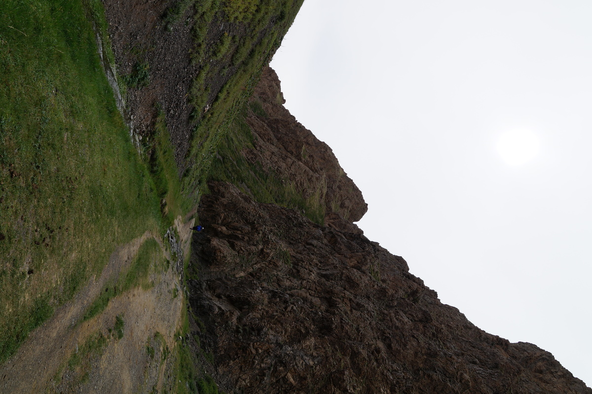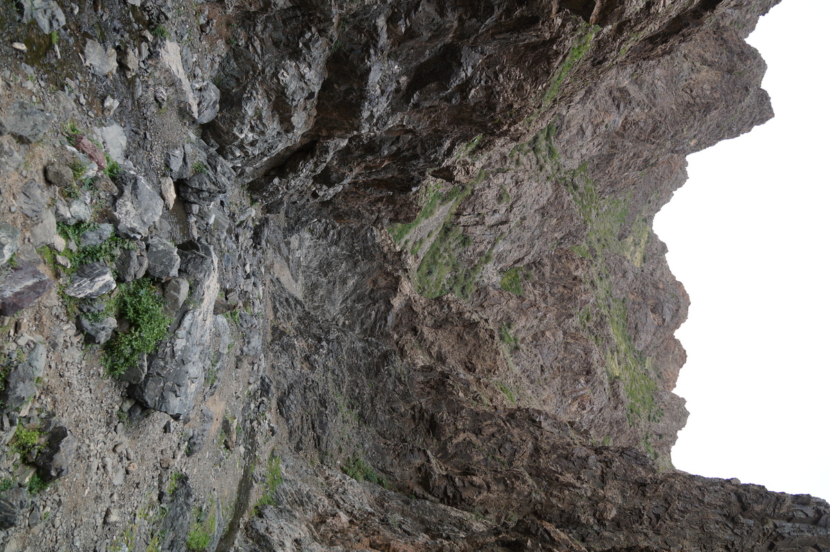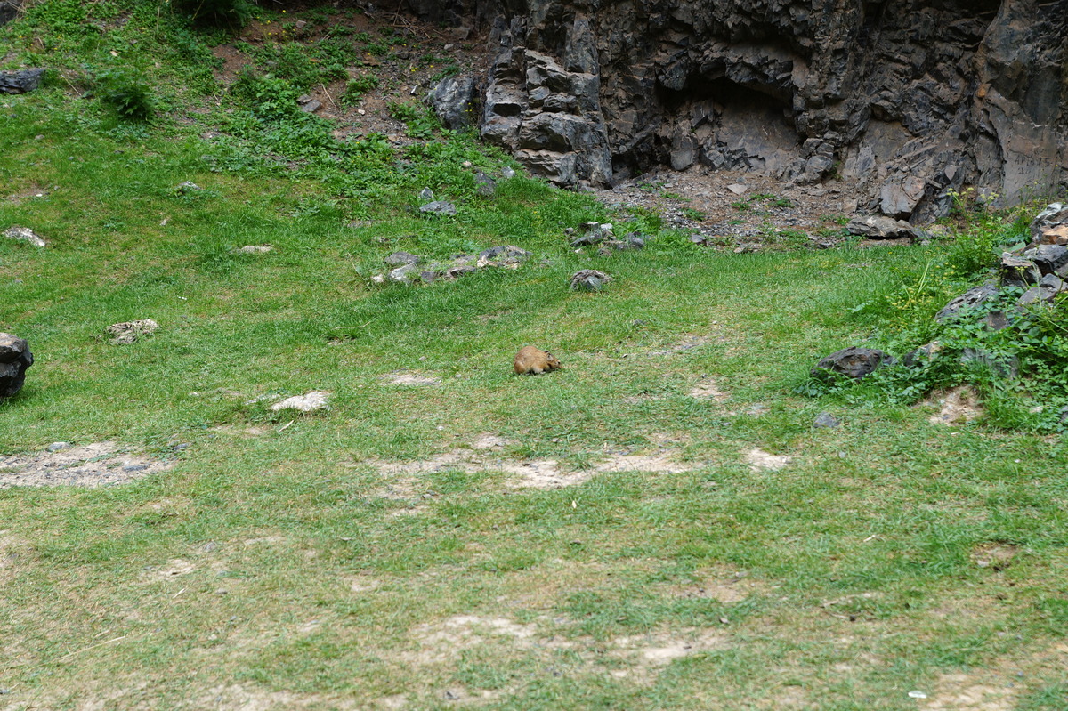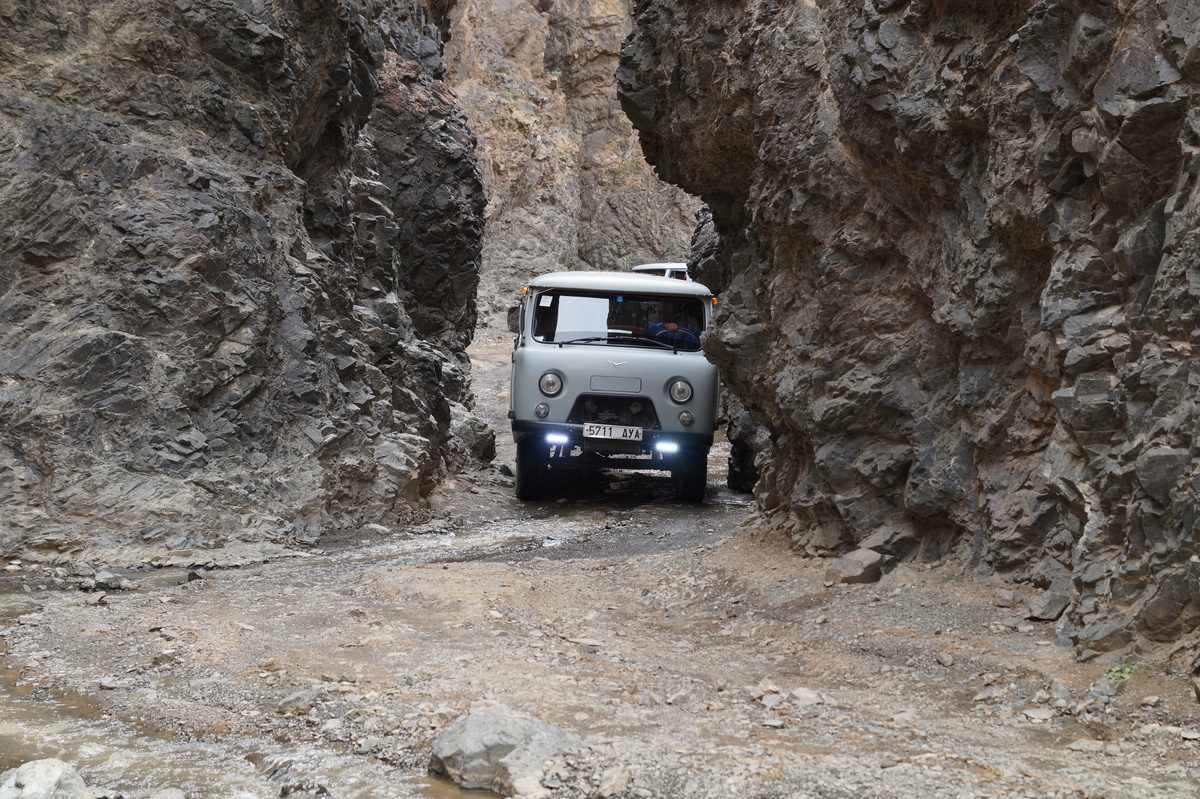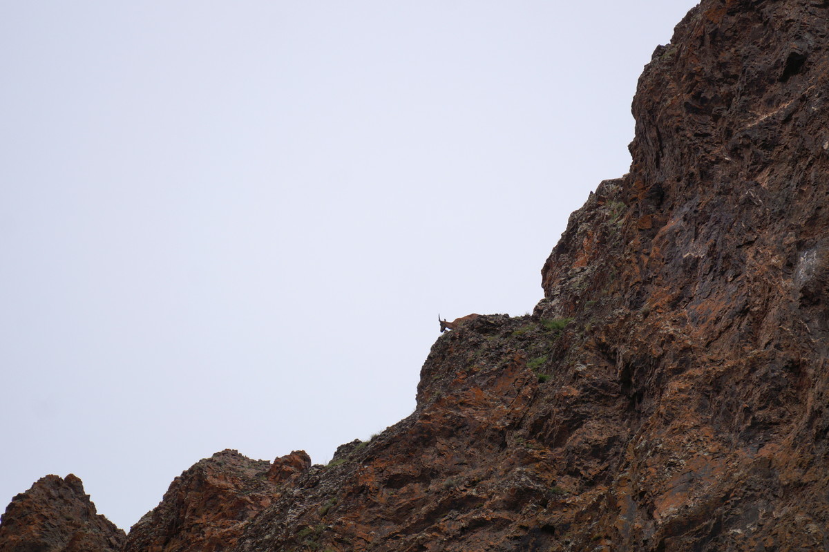 Geierschlucht. Kurz vor drei Uhr nachmittags erreichen wir die Geierschlucht (Yolyn Am). Es wird berichtet, dass der Grund dieser Schlucht nie einen Sonnenstrahl abbekommt, sodass man dort im Sommer Eis finden kann, aber auch hier wirkt sich die globale Klimaerwärmung aus. So kalt ist es tatsächlich nicht; man kann barfuß durch den Bach waten. Im Yolyn-Museum nahe der Hauptstraße kann man sich ein paar ausgestopfte Tiere ansehen.